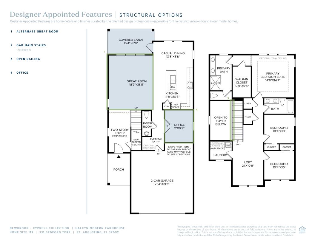 The Halcyn’s covered entry opens into a soaring two-story foyer that offers views to the impressive great room and lovely covered lanai. Defining the well-designed kitchen is a sizable casual dining area, an oversized center island with breakfast bar, wraparound counter and cabinet space, and a roomy pantry. The alluring primary bedroom suite is complete with dual walk-in closets and a gorgeous primary bath with a dual-sink vanity, a large luxe shower, linen storage, and a private water closet. Overlooking an ample loft, secondary bedrooms with sizable closets share a hall bath with a dual-sink vanity. Additional highlights include conveniently located second-floor laundry, a generous flex room, a powder room, and additional storage throughout.