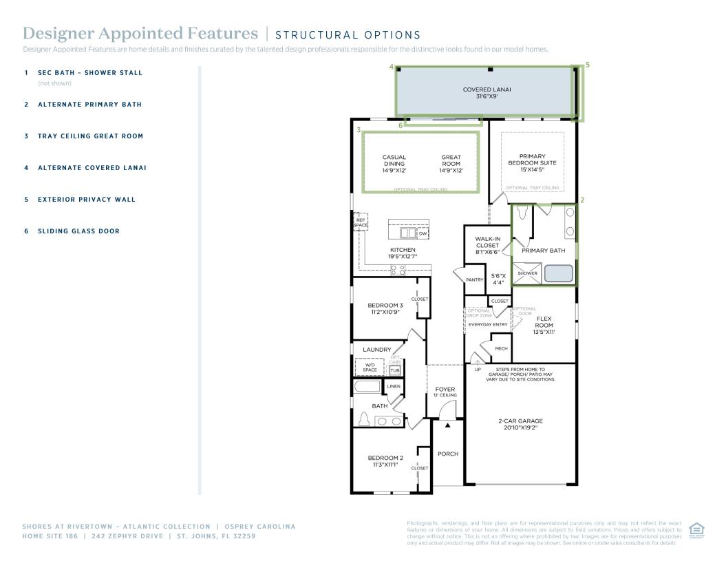 Experience refined single-level living with the lovely Oceana. A welcoming foyer hallway leads to a casual dining area and a spacious great room with access to the beautiful covered lanai. The well-appointed kitchen is enhanced by a large center island with breakfast bar, wraparound counter and cabinet space, and an ample pantry. Highlighting the impressive primary bedroom suite is a generous walk-in closet and a stunning primary bath with a dual-sink vanity, a luxe shower, and a private water closet. Secondary bedrooms feature sizable closets and a shared hall bath with a dual-sink vanity. Additional highlights include a roomy flex room off the foyer, easily accessible laundry, and ample additional storage.