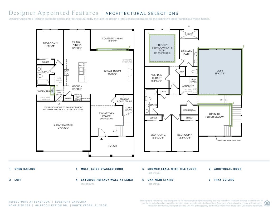 The Edgeport's expansive covered porch and stunning two-story foyer reveal the gigantic great room, bright casual dining area, and desirable covered lanai beyond. The well-designed kitchen is complete with a large center island with breakfast bar, plenty of counter and cabinet space, and ample pantry. The luxurious primary bedroom suite is highlighted by a huge walk-in closet and spa-like primary bath with dual-sink vanity, large luxe shower, and private water closet. Secondary bedrooms feature roomy closets and shared full hall bath with dual-sink vanity, and are central to a generous loft. Additional highlights include a secluded first floor bedroom with closet and shared full hall bath, thoughtful workspace, convenient everyday entry, centrally located laundry, and additional storage.
