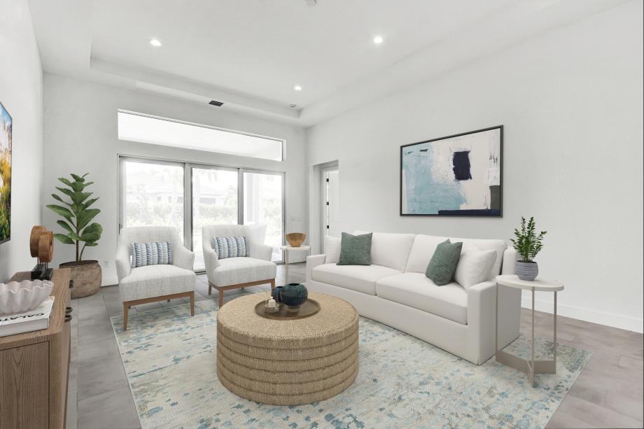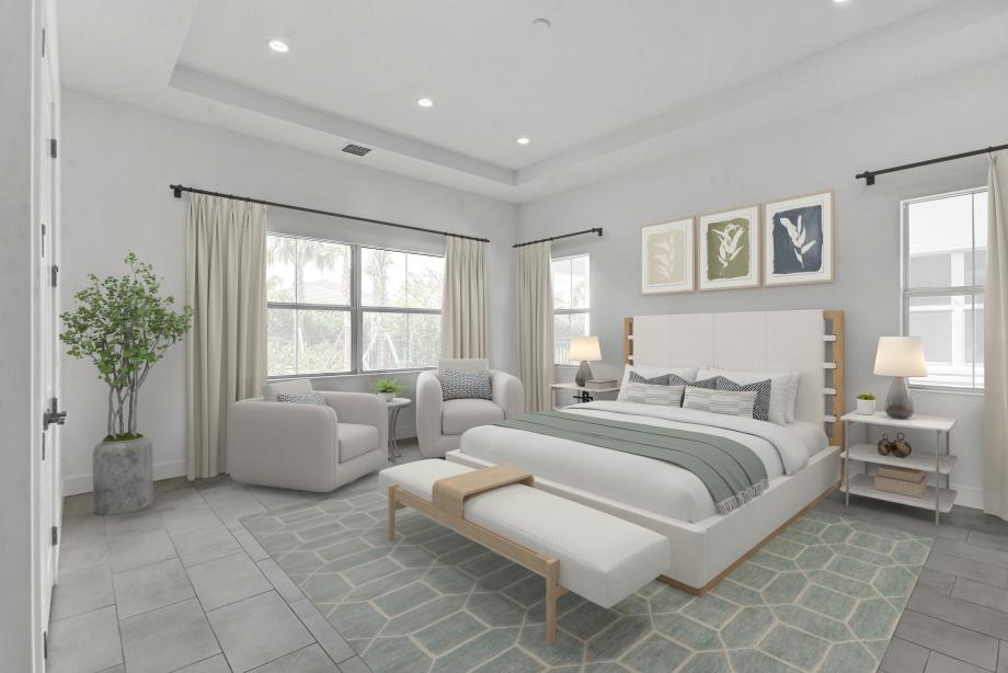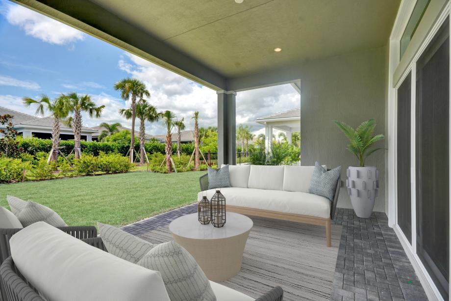 The Samantha's inviting covered entry and foyer with tray ceiling flow into the spacious great room and dining room with tray ceilings, and a view of the desirable covered lanai beyond. The well-designed kitchen is complete with a large center island with breakfast bar, plenty of counter and cabinet space, and ample pantry. The charming primary bedroom suite is enhanced by a lovely tray ceiling, huge walk-in closet, and deluxe primary bath with dual-sink vanity, large soaking tub, luxe glass-enclosed shower with seat, and private water closet. The secondary bedroom features a walk-in closet and full hall bath access. Additional highlights include a bright office off the foyer, centrally located laundry, and additional storage.