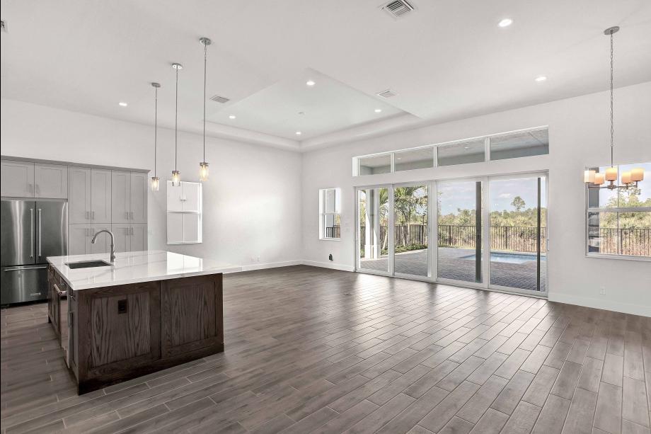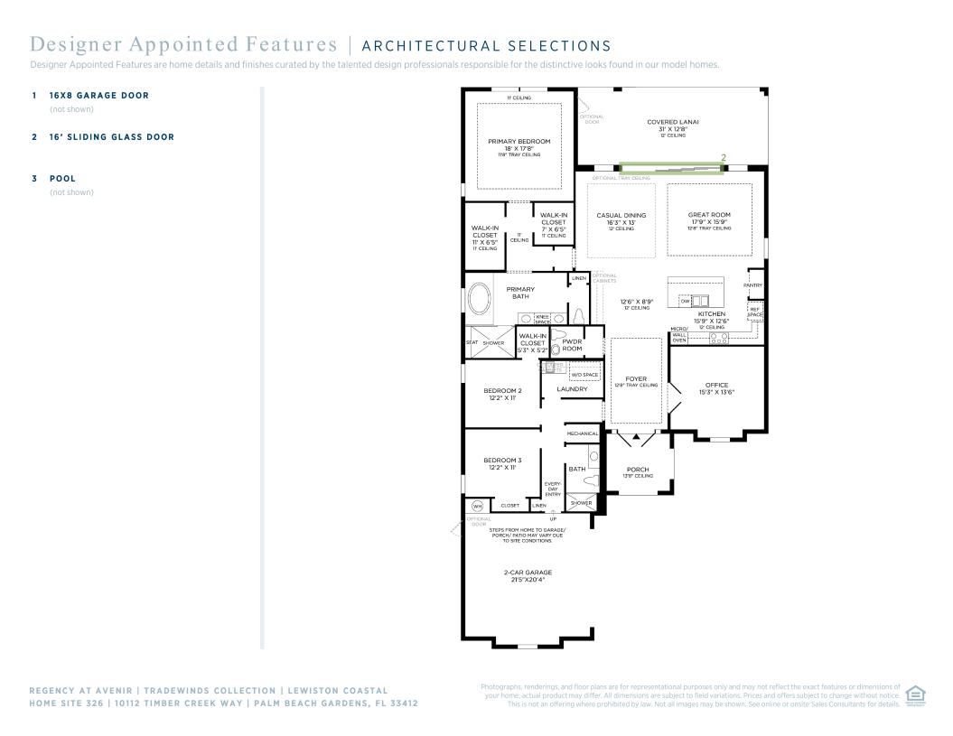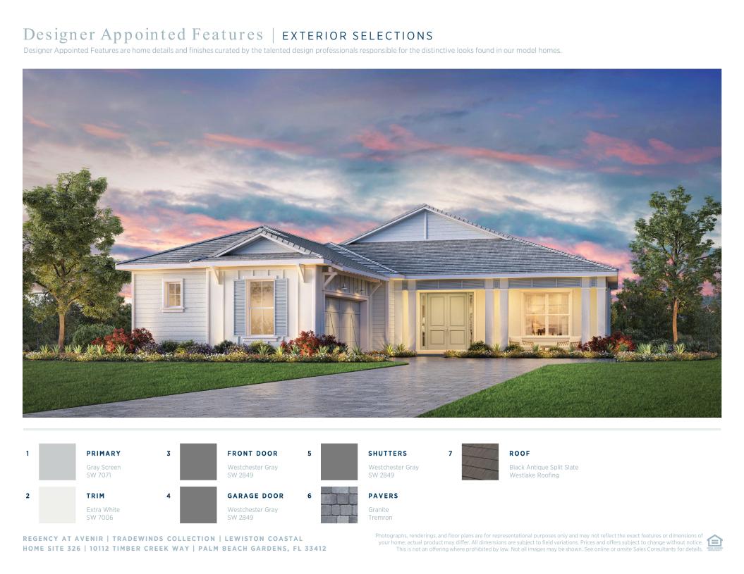 The Lewiston's inviting covered entry and foyer with tray ceiling opens to views of the spacious great room and dining room and sunlit covered lanai. The well-designed kitchen features a large center island with breakfast bar, plenty of counter and cabinet space, and a roomy pantry. The impressive primary bedroom suite is enhanced by a beautiful tray ceiling, dual walk-in closets, and deluxe primary bath with dual-sink vanity, large soaking tub, luxe glass-enclosed shower with seat, linen storage, and private water closet. Sizable secondary bedrooms feature ample closets and a shared full hall bath. Additional highlights include a versatile flex room off the foyer, centrally located laundry, and additional storage.