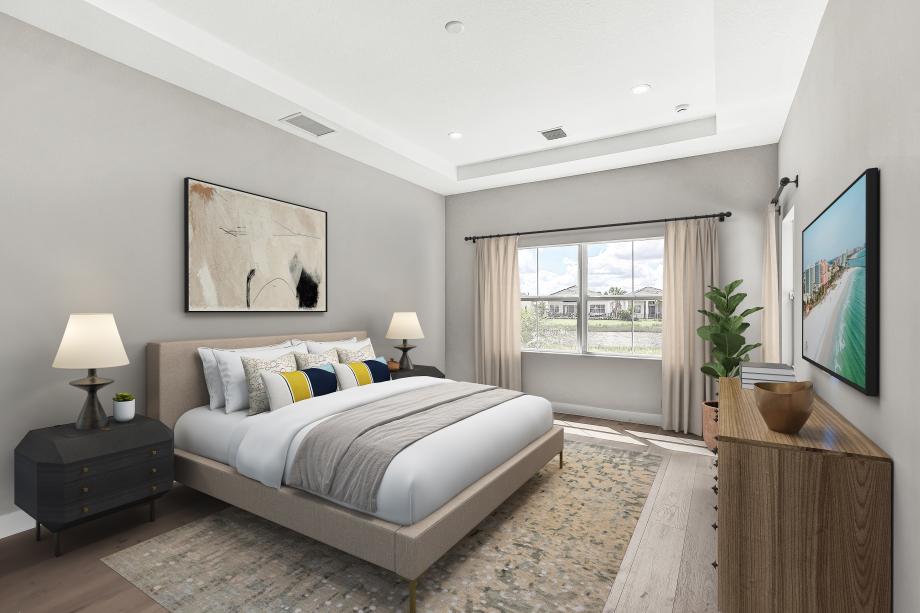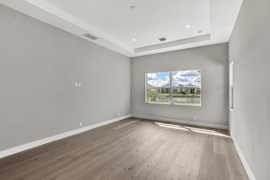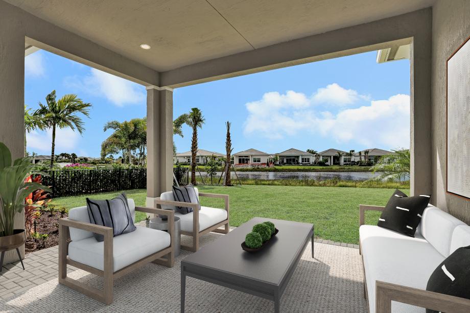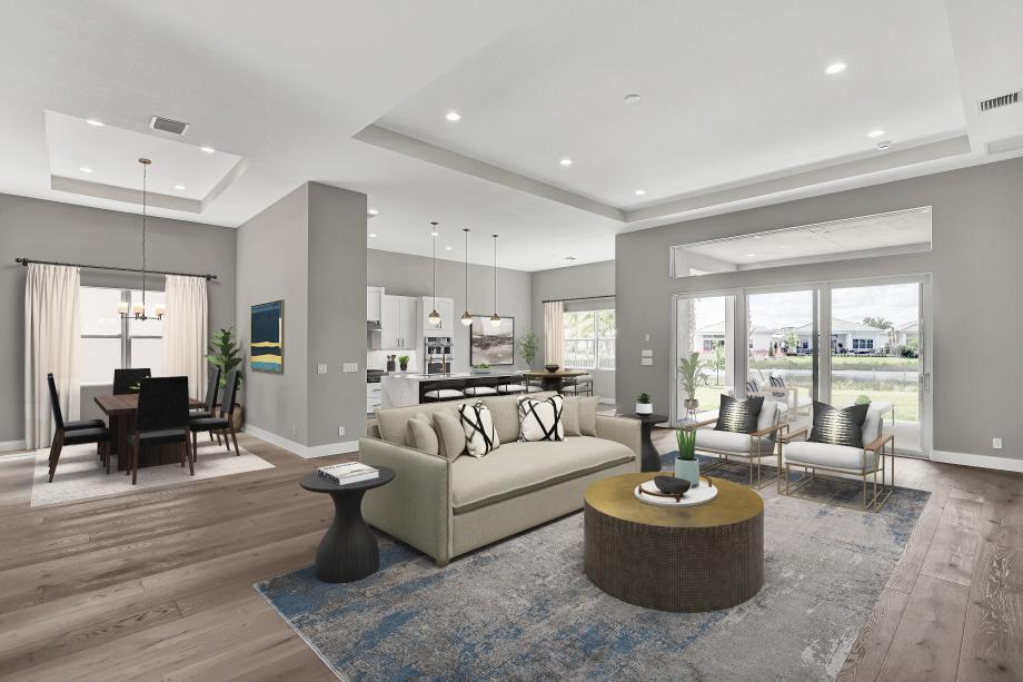 The Shelby features an inviting covered entry and welcoming foyer that open to an expansive great room and dining area with elegant tray ceilings and views of the desirable covered lanai and scenic lake beyond. The well-appointed kitchen overlooks a bright casual dining space and offers a large center island, ample counter and cabinet space, and a generous pantry. The serene primary bedroom suite is highlighted by a sophisticated tray ceiling, spacious walk-in closet, and a luxurious primary bath with dual-sink vanity, large soaking tub, glass-enclosed shower with seat, and private water closet. Spacious secondary bedrooms each include walk-in closets—one with a private full bath and the other with access to a shared hall bath. Additional features include a versatile flex room off the foyer, a centrally located laundry area, and abundant storage throughout.