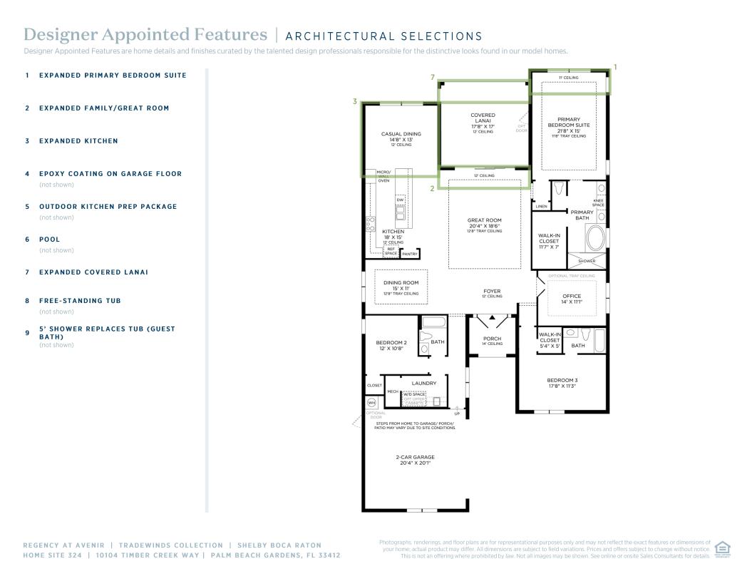 The Shelby welcomes you with an inviting covered entry and elegant foyer that opens to a spacious great room and dining area featuring striking 12' high tray ceilings and views of the desirable covered lanai beyond. The well-designed kitchen overlooks a bright casual dining area and boasts a large center island with a breakfast bar, abundant counter and cabinet space, and a generous pantry. The serene primary bedroom suite impresses with its elegant tray ceiling, expansive walk-in closet, and deluxe bath featuring a dual-sink vanity, large soaking tub, luxe glass-enclosed shower, and private water closet. Two spacious secondary bedrooms each include walk-in closets—one with a private full bath and the other with access to a shared hall bath. Additional highlights include a versatile flex room off the foyer, a centrally located laundry room, and extra storage throughout. Enjoy outdoor living at its finest with your private swimming pool and peaceful preserve view.