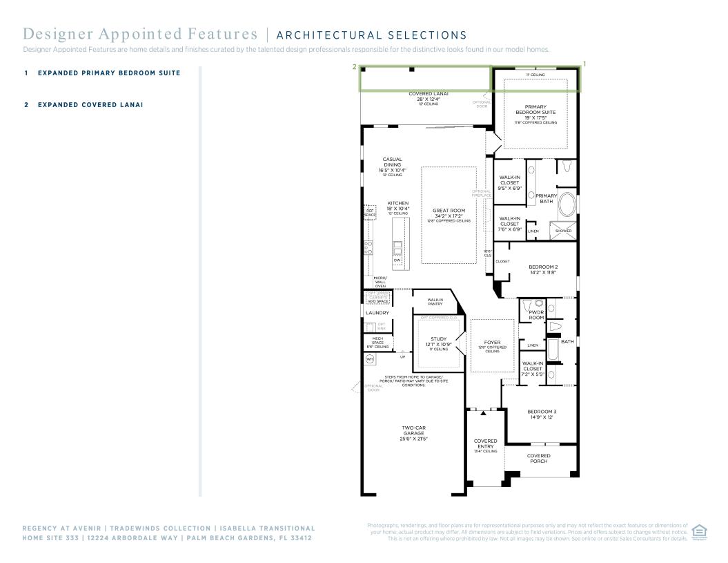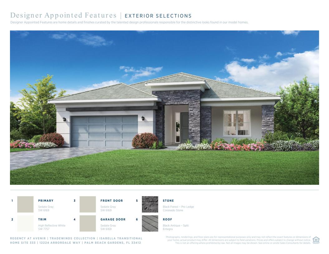The Isabella's inviting covered porch and entry lead into the stunning foyer, revealing the expansive great room with coffered ceiling, bright casual dining area, and spacious covered lanai beyond. The well-designed kitchen features a large center island with breakfast bar, plenty of counter and cabinet space, and a sizable walk-in pantry. The sophisticated primary bedroom suite is enhanced by a lovely coffered ceiling, dual walk-in closets, and deluxe primary bath with dual-sink vanity, large soaking tub, luxe glass-enclosed shower, linen storage, and private water closet. Secondary bedrooms feature ample closets and shared bath with separate dual-sink vanity areas. Additional highlights include a private flex room off the foyer, a convenient powder room, centrally located laundry, and additional storage.