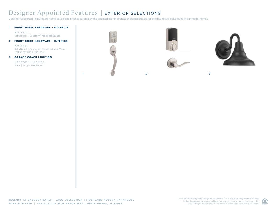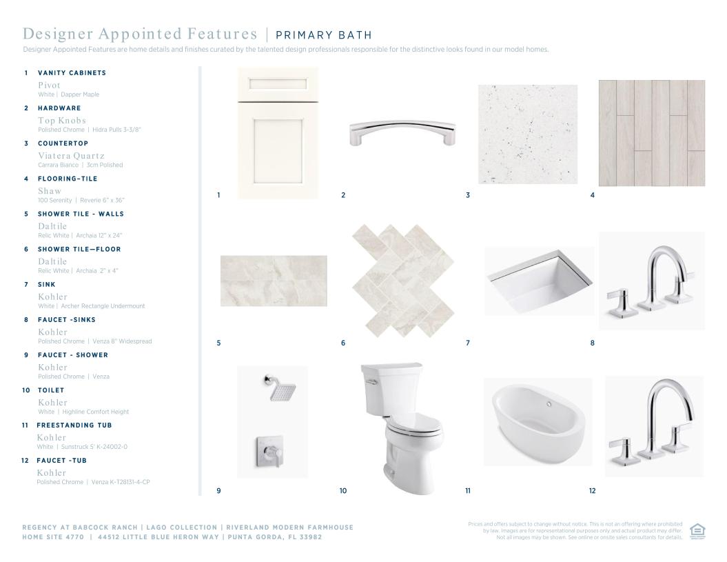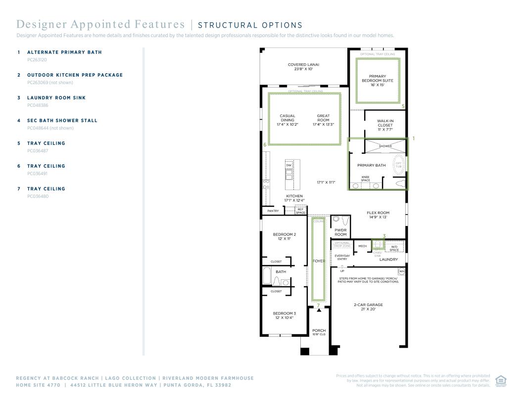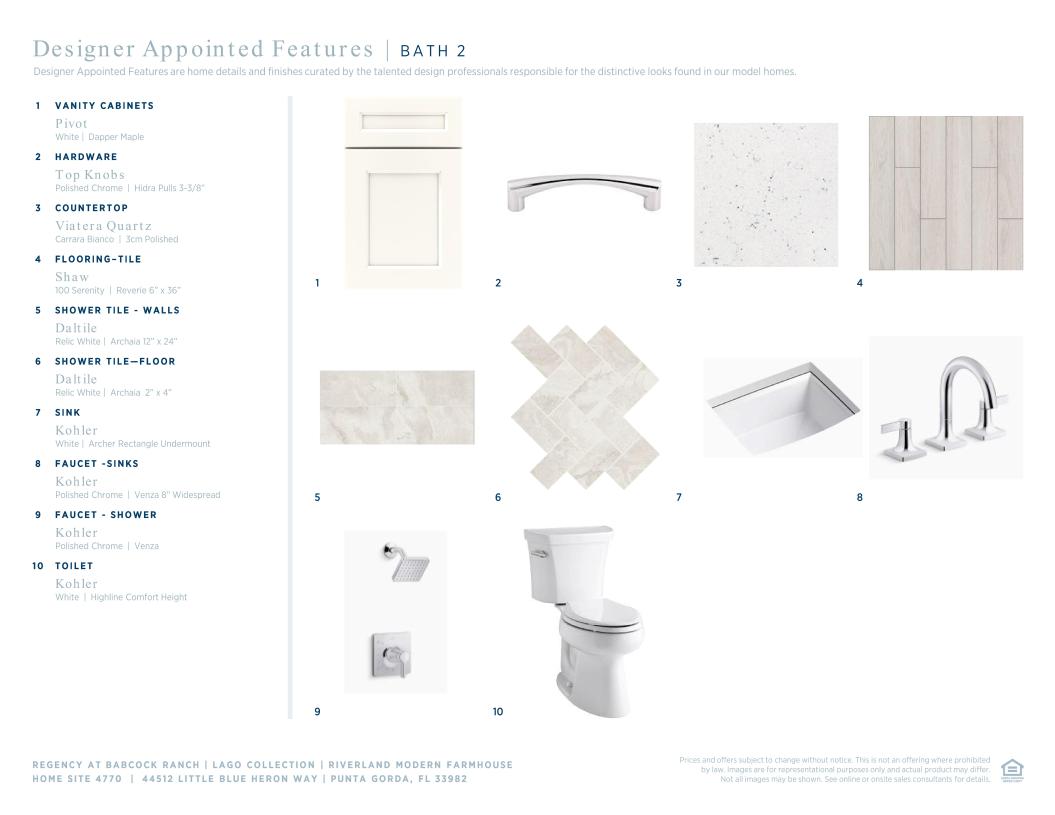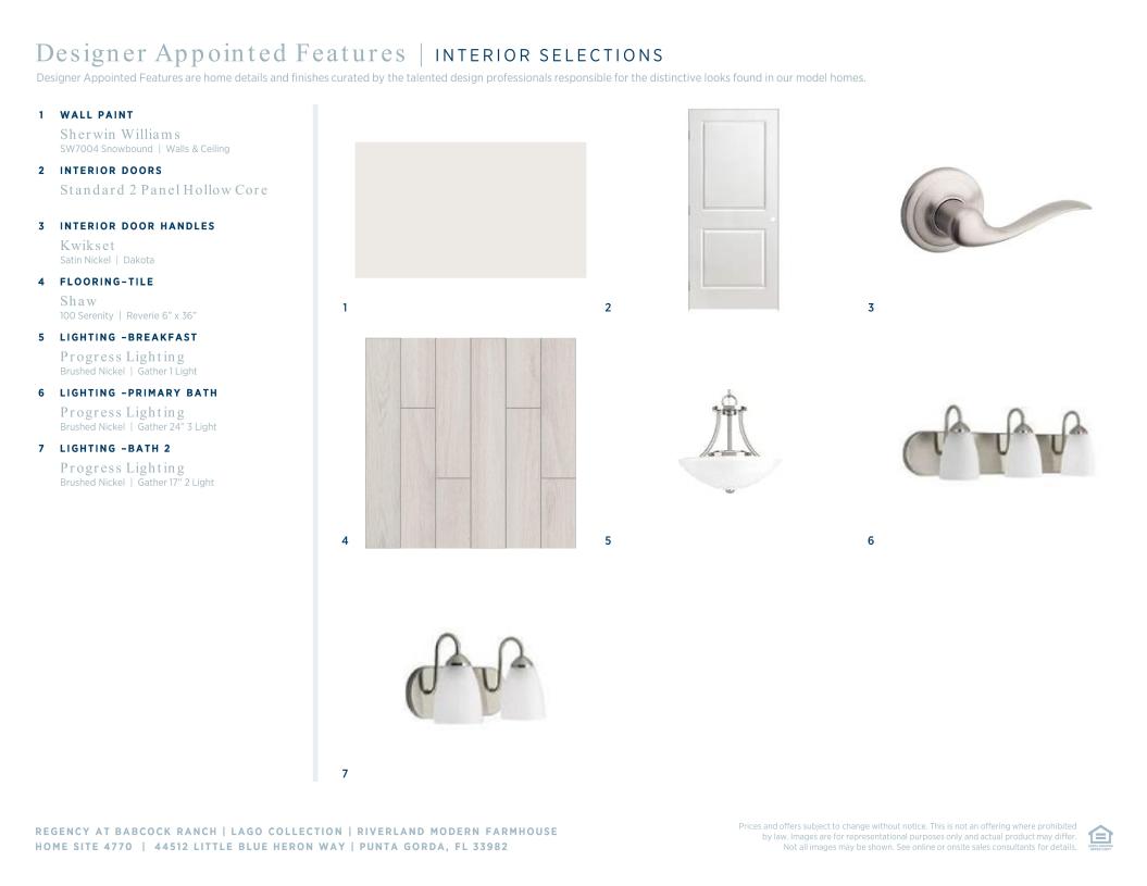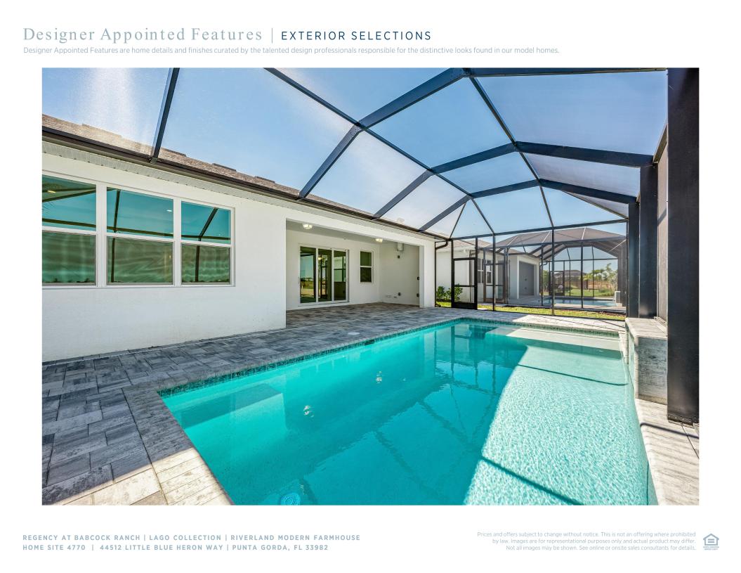 At 2,452 square feet, this Riverland Modern Farmhouse includes three bedrooms, two full bathrooms, one half bathroom, flex space, and a two-car garage. This home features architectural elements including tray ceilings in the foyer, primary bedroom, and great room. Enhancing the gorgeous primary bedroom suite is a generous walk-in closet and a spa-like primary bath with dual vanities, a large luxe shower, and a private water closet. Secondary bedrooms are conveniently located off the foyer, featuring sizable closets and a shared hall bath. Outdoor living includes a covered lanai with an outdoor kitchen prep. Additional features include a centrally located laundry room with additional upper cabinetry, a versatile flex room, and a convenient everyday entry.