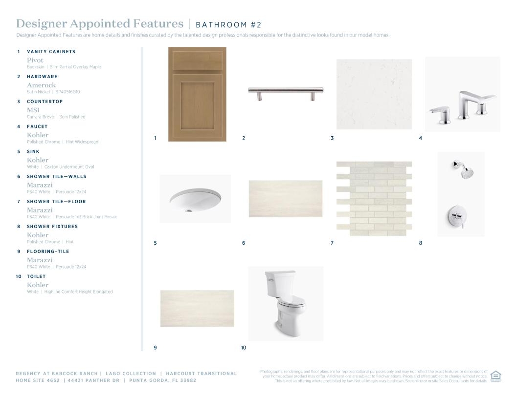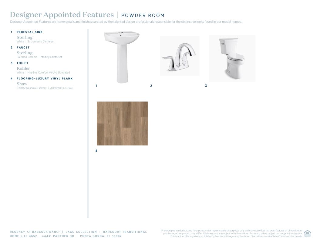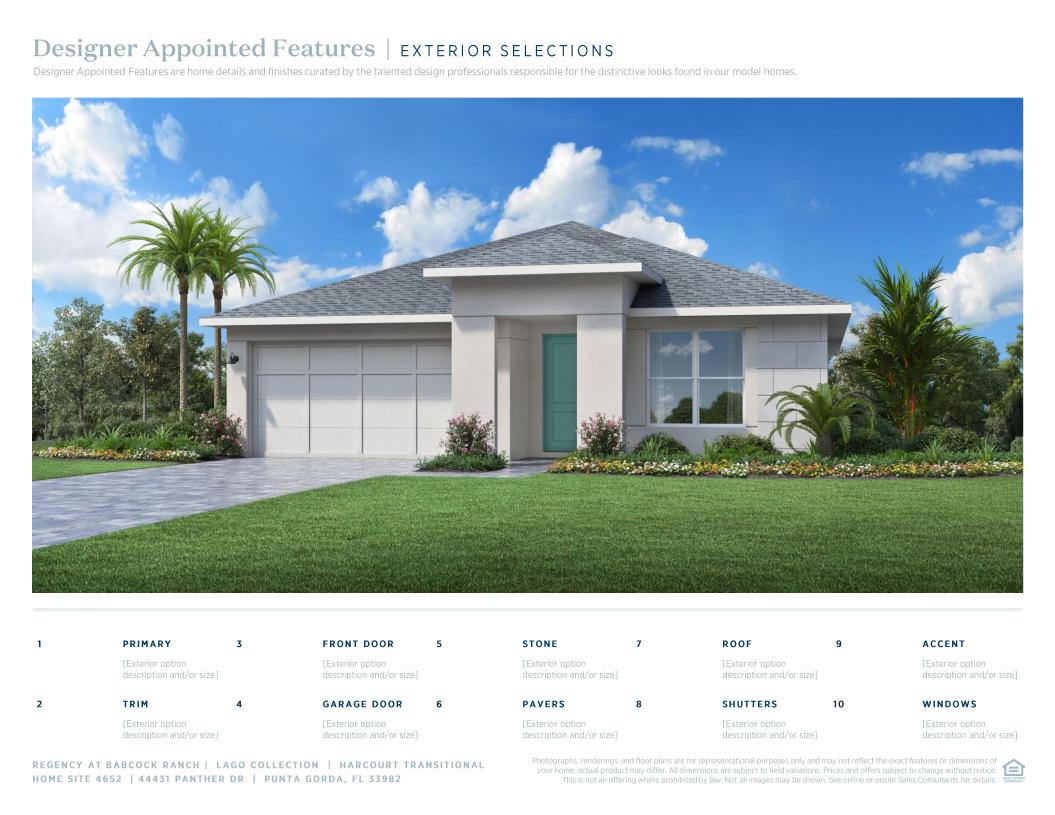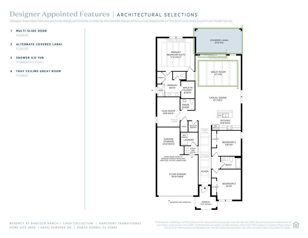 The Harcourt’s elongated foyer hallway offers views to the splendid great room with coffered ceiling and the beautiful covered lanai beyond. The well-designed kitchen is complemented by a spacious casual dining area, a large center island with breakfast bar, plenty of counter and cabinet space, and a roomy walk-in pantry. Enhancing the superb primary bedroom suite is an elegant coffered ceiling, an ample walk-in closet, and a luxurious primary bath with a dual-sink vanity, a large luxe shower, linen storage, and a private water closet. Secondary bedrooms with roomy closets share a hall bath. Additional highlights include a sizable flex room, easily accessible laundry off the everyday entry, a convenient powder room, and plenty of additional storage.