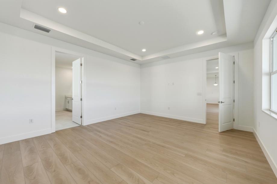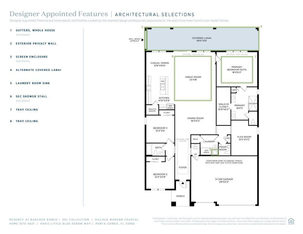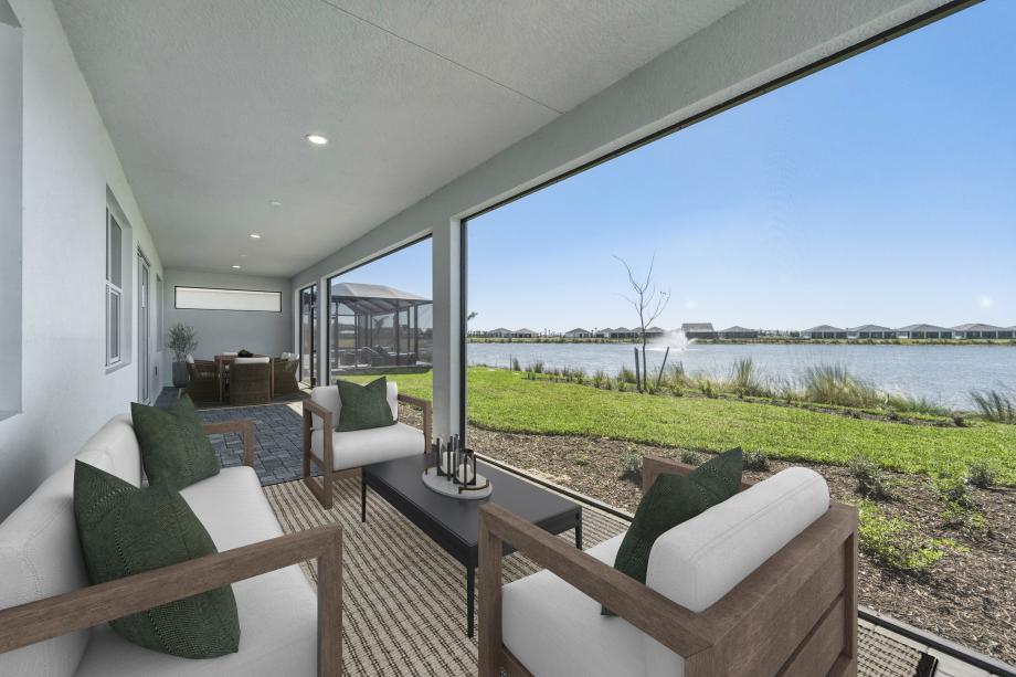 The Hillock's foyer hallway sweeps into a lovely dining room, an impressive great room with coffered ceiling, and an expansive covered lanai beyond. Adjacent to a bright casual dining area, the well-appointed kitchen offers an oversized center island with breakfast bar, ample counter and cabinet space, and a roomy walk-in pantry. The secluded primary bedroom suite is complemented by an elegant coffered ceiling, a generous walk-in closet, and a serene primary bath with dual vanities, a large luxe shower, linen storage, and a private water closet. Secondary bedrooms feature sizable closets and a shared hall bath. Additional highlights include an ample flex room, conveniently located laundry, a powder room, and plenty of additional storage.