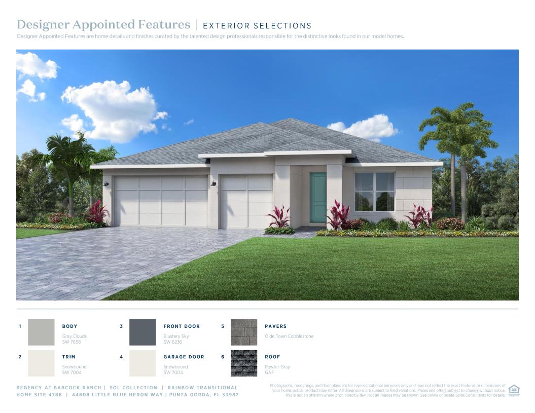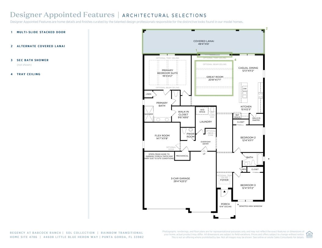 An inviting extended foyer offers appealing views to the Rainbow's spacious great room with coffered ceiling and desirable covered lanai. The well-designed kitchen is highlighted by a cozy casual dining area, a large center island with breakfast bar, plenty of counter and cabinet space, and a sizable walk-in pantry. Enhancing the gracious primary bedroom suite is a lovely coffered ceiling, an ample walk-in closet, and a gorgeous primary bath with a dual-sink vanity, a large luxe shower, linen storage, and a private water closet. Secondary bedrooms feature roomy closets and share a large hall bath. Additional highlights include a generous flex room, easily accessible laundry off the everyday entry, a convenient powder room, and additional storage throughout.