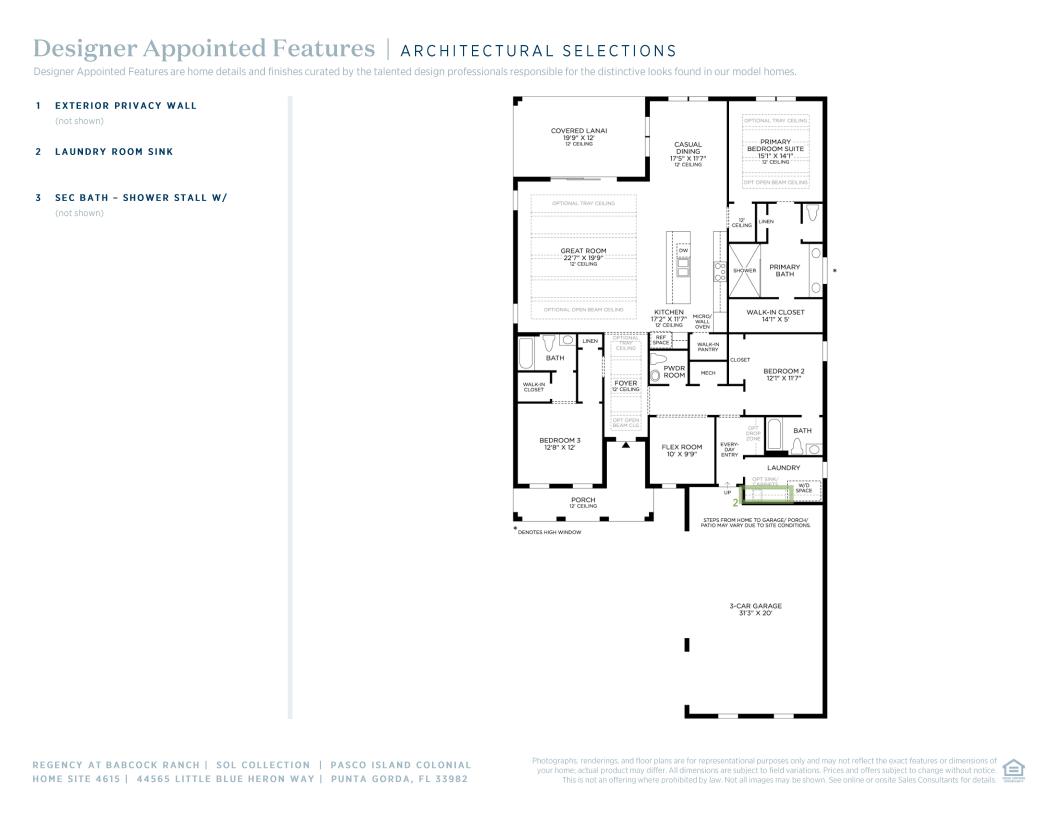 Wonderfully designed with elegant fixtures throughout an open-concept floor plan, the Pasco leaves a lasting impression. An elegant foyer flows into the beautiful great room, enhanced with a coffered ceiling and views of the covered lanai. Adjacent to the bright casual dining area is the expertly crafted kitchen, offering a large center island with breakfast bar, ample counter and cabinet space, and a sizable walk-in pantry. The charming primary bedroom suite is complemented by a palatial walk-in closet and a gracious primary bath with a dual-sink vanity, a large luxe shower, linen storage, and a private water closet. Secondary bedrooms, one with a walk-in closet and the other with a roomy closet, are secluded off the foyer and feature private baths. Additionally featured in the Pasco is a versatile flex room, easily accessible laundry off the everyday entry, a powder room, and ample additional storage.