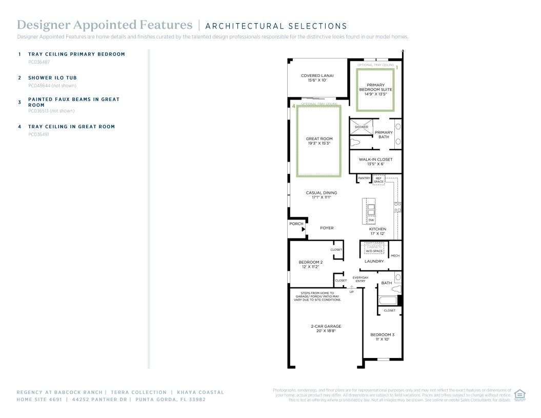 Step into elegant living with this beautifully upgraded 1,802-square-foot side-entry villa, offering 2 spacious bedrooms, 2 stylish bathrooms, and a bright, open-concept layout designed for comfort and style. A tray ceiling with painted faux beams in the great room adds architectural charm, while a tray ceiling in the primary bedroom enhances the home’s luxurious feel. The upgraded front door sets a sophisticated tone from the start, and the guest bath features a shower in lieu of a tub for elevated comfort. Impact-resistant windows and doors come standard, offering added safety and energy efficiency. Enjoy the opportunity to personalize your outdoor oasis—this homesite provides ample space for a future pool and spa, making it ideal for relaxing or entertaining in style.