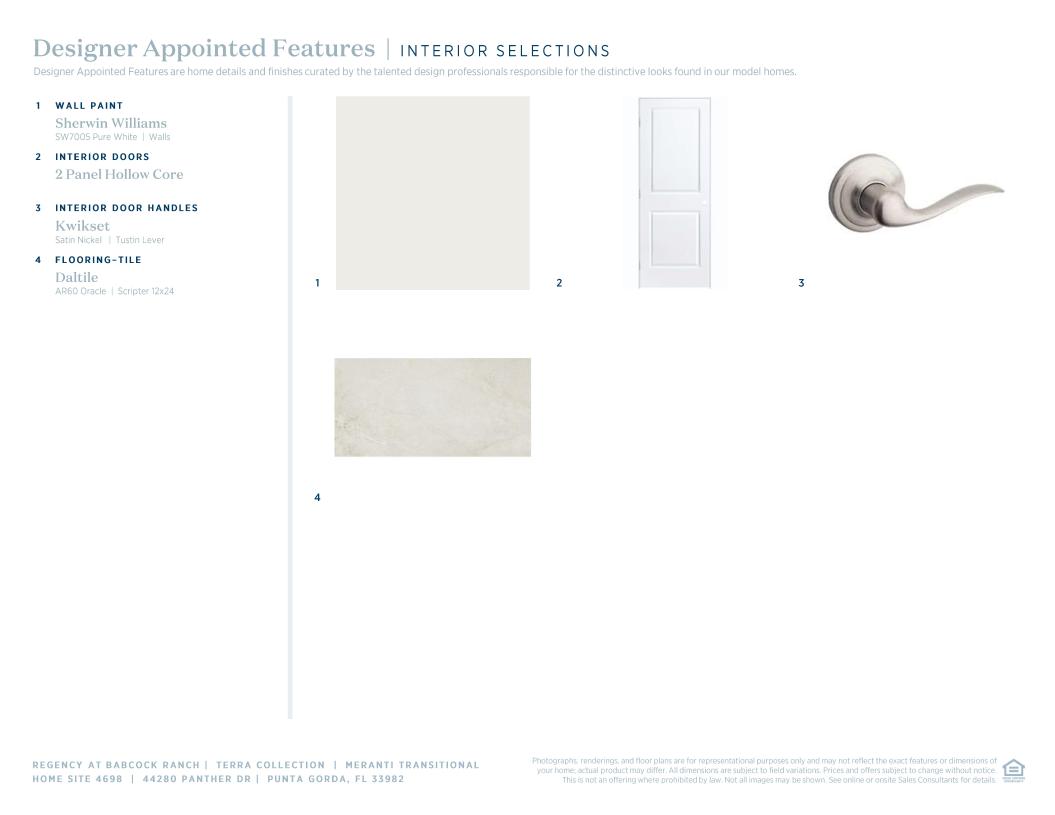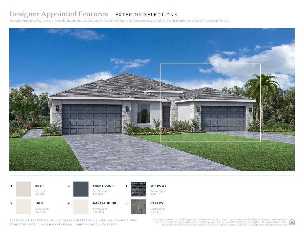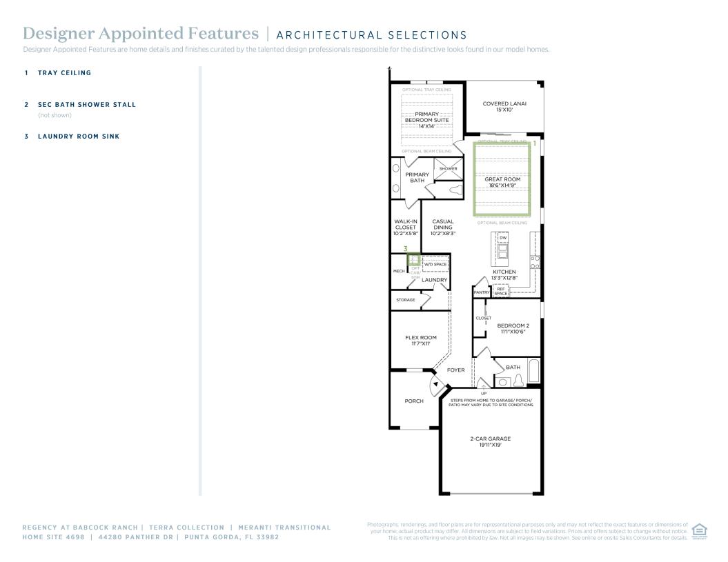 A bright foyer and flex room flow into the Meranti's airy great room with adjacent casual dining area, and views to the beautiful covered lanai. Defining the well-designed kitchen is a large center island with breakfast bar, wraparound counter and cabinet space, and a roomy pantry. The lovely primary bedroom suite is complete with a sizable walk-in closet and a spa-like primary bath with a dual-sink vanity, a large luxe shower, and a private water closet. The ample secondary bedroom features a generous closet and a shared hall bath. Additional highlights include easily accessible laundry and additional storage throughout.