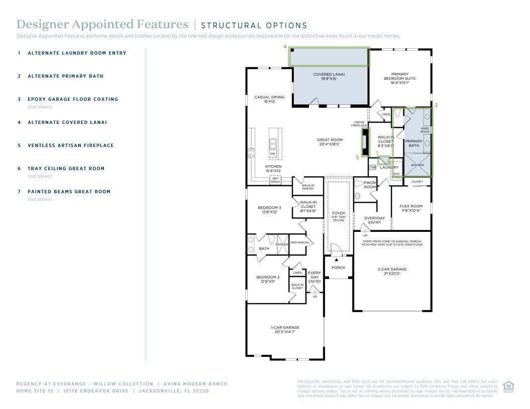 The Avina is a thoughtfully arranged home design ideal for a variety of lifestyles. An elegant foyer with a tray ceiling leads to a spacious great room that flows into a bright casual dining area. Positioned for easy entertaining, the well-equipped kitchen features a convenient walk-in pantry, a center island with breakfast bar, and wraparound counters. A beautiful covered lanai just off the main living area offers a serene space for gathering. The gorgeous primary bedroom provides a private retreat with its ample walk-in closet and luxurious bathroom, complete with dual vanities, a spa-like shower, and a private water closet. Two secondary bedrooms complete with walk-in closets share a full bath with a dual-sink vanity. Other desirable features include a versatile flex room, everyday entries off both garages, a dedicated laundry space, and a powder room.