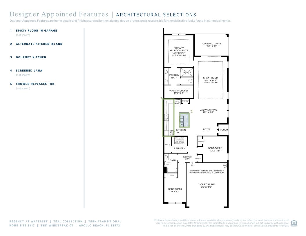 Style meets functionality in the Tern home design, featuring a generous open floor plan. The charming foyer opens into the casual dining area and the great room with a graceful tray ceiling. The well-appointed kitchen offers a center island with breakfast bar, useful pantry cabinet, and plenty of counter and cabinet space. Natural light floods in through multi-slide stacked doors opening onto the outdoor covered lanai. The appealing primary bedroom features an elegant tray ceiling, a spacious walk-in closet, and a tranquil primary bath with a dual-sink vanity, a luxe shower, and a private water closet. Two lovely secondary bedrooms are just steps away from a full hall bath. Additional highlights include an everyday entry, centrally located laundry, and extra storage throughout.