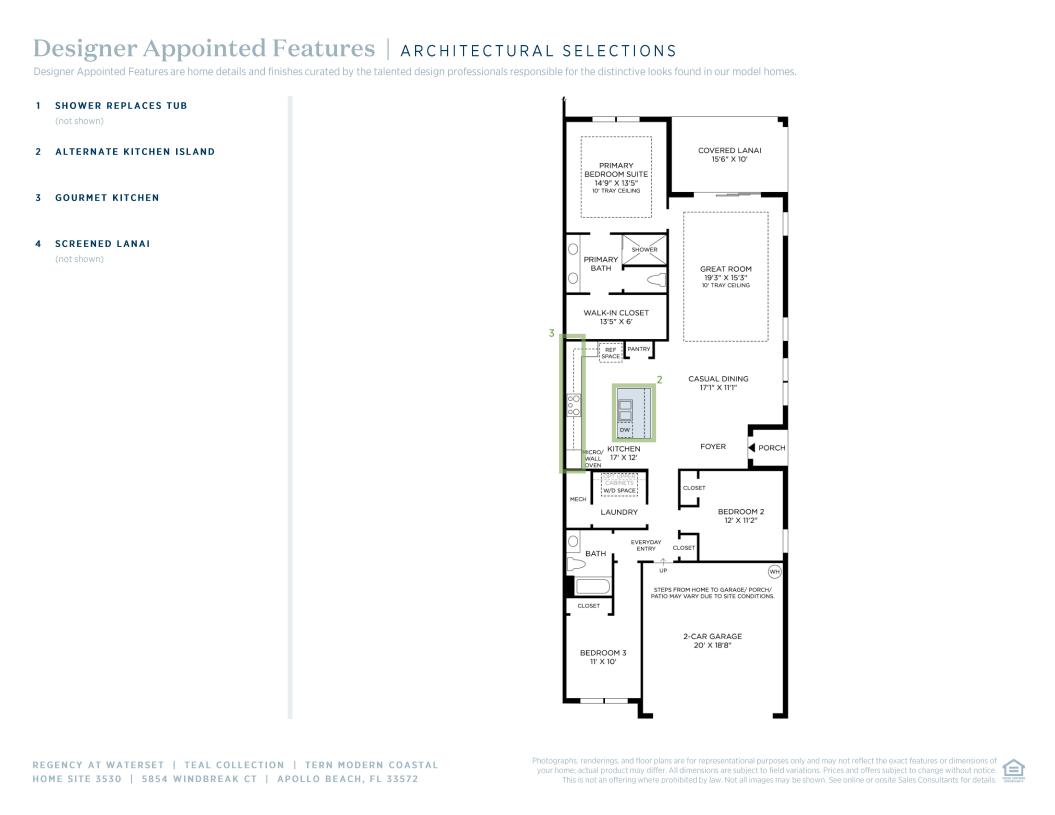 Style meets functionality in the Tern home design, featuring a generous open floor plan. The charming foyer opens into the casual dining area and the great room with a graceful tray ceiling. The well-appointed kitchen offers a center island with breakfast bar, useful pantry cabinet, and plenty of counter and cabinet space. Natural light floods in through multi-slide stacked doors opening onto the outdoor covered lanai. The appealing primary bedroom features an elegant tray ceiling, a spacious walk-in closet, and a tranquil primary bath with a dual-sink vanity, a luxe shower, and a private water closet. Two lovely secondary bedrooms are just steps away from a full hall bath. Additional highlights include an everyday entry, centrally located laundry, and extra storage throughout.