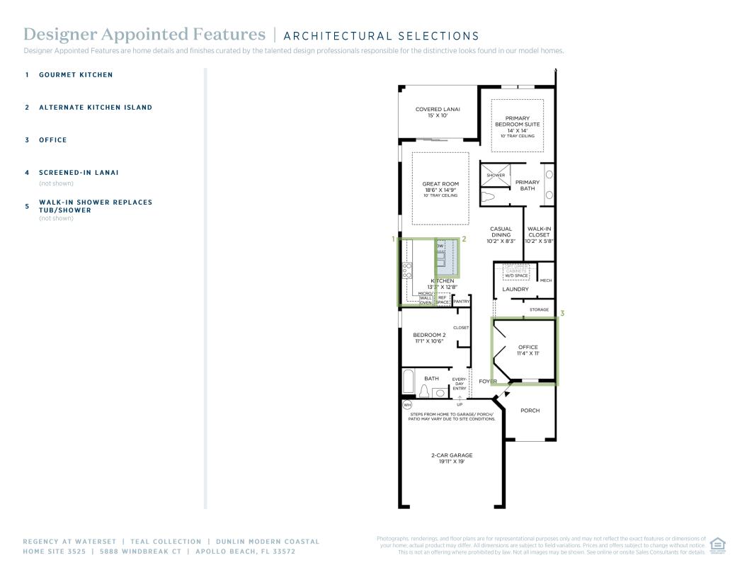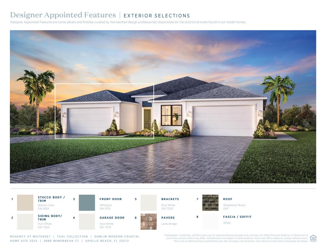 The Dunlin home design offers an elegant and convenient single-story floor plan. From a generous porch, the foyer flows past a versatile flex room into the beautiful main living space, including a casual dining area, and a great room with an elegant tray ceiling. Lovely sliding doors lead to a stunning covered lanai, perfect for entertaining. The l-shaped kitchen features a spacious center island with breakfast bar, a useful pantry cabinet, and plenty of cabinet and counter space. Retreat to the secluded primary bedroom, enhanced by a tray ceiling, a walk-in closet, and a serene bath with a dual-sink vanity, a luxe shower, and a private water closet. A charming secondary bedroom is located close to a full hall bath. Other highlights include an everyday entry, centrally located laundry, and extra storage throughout.