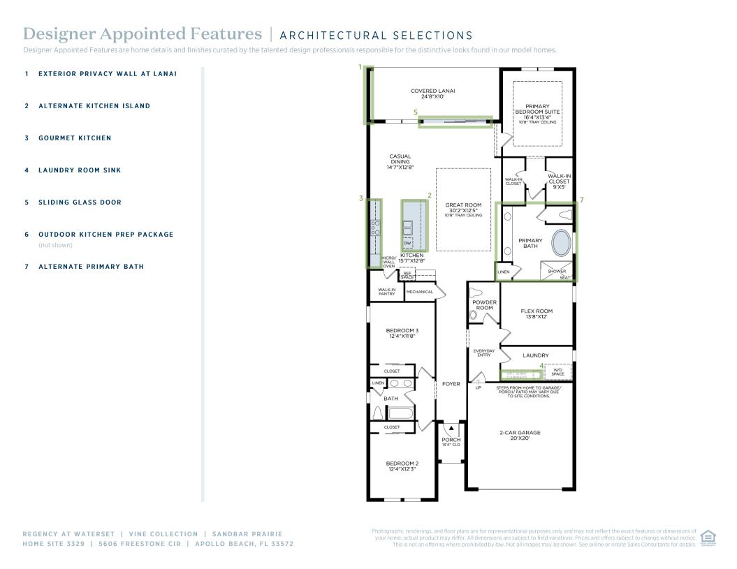 The Sandbar is a beautifully designed single-story floor plan ideal for a variety of lifestyles. Upon entry, the foyer leads directly to an elegant great room with tray ceiling detail and abundant natural light from the covered lanai beyond. Just steps from a charming casual dining area, the stylish kitchen offers an expansive island with breakfast bar, a walk-in pantry, and plentiful counter and cabinet space. Tucked away, the primary bedroom is enhanced by a tray ceiling, dual walk-in closets, and a tranquil bath featuring a dual-sink vanity, a luxe shower with seat, linen storage, and a private water closet. Two charming secondary bedrooms share a full hall bath with a dual-sink vanity. Additional notable features include a versatile flex room, dedicated laundry space off the everyday entry, and a powder room.