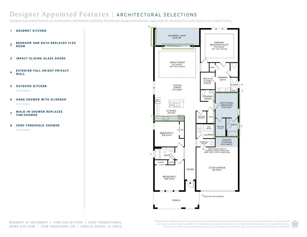 The Cove home design offers a sophisticated and convenient floor plan. An inviting foyer leads guests into the heart of the home, including a casual dining area and an L-shaped kitchen complete with an island with a breakfast bar and a walk-in pantry. Adjacent, the elegant great room is enhanced by a tray ceiling and access to a lovely covered patio. The primary bedroom is a true retreat offering a stunning tray ceiling, a walk-in closet, and a tranquil bath complete with a dual-sink vanity, a luxe shower with seat, linen storage, and a private water closet. Two beautiful secondary bedrooms are convenient to a full hall bath. Additional highlights include a versatile flex room, centrally located laundry off the everyday entry, and ample storage.