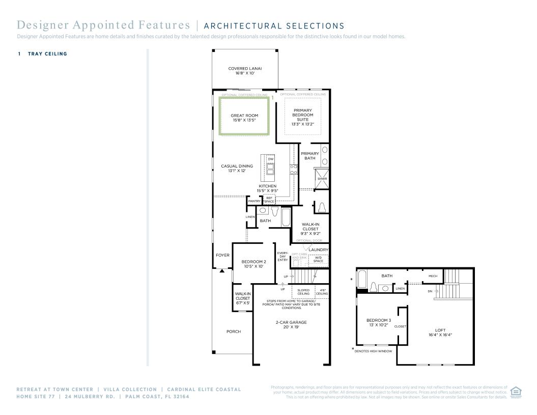 Deluxe townhome style. The Cardinal Elite's inviting covered porch and entry flow into the welcoming foyer, revealing the beautiful dining room, spacious great room, and desirable covered lanai beyond. The well-designed kitchen is complete with a large center island with breakfast bar, plenty of counter and cabinet space, and roomy walk-in pantry. The charming primary bedroom suite is highlighted by a huge walk-in closet and spa-like primary bath with dual-sink vanity, large luxe shower, and private water closet. The secondary bedroom features a walk-in closet and shared hall bath. Secluded on the second floor, a bedroom suite with ample closet and shared hall bath overlooks a generous loft. Additional highlights include a convenient everyday entry, centrally located laundry, , and additional storage.