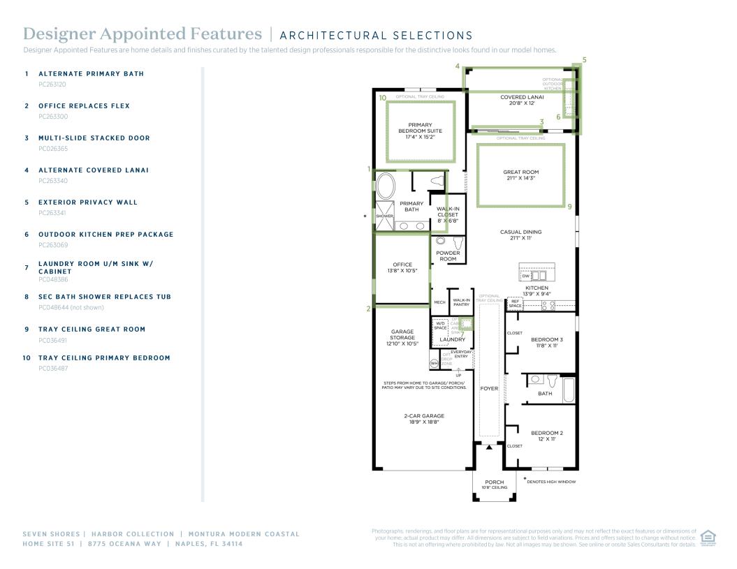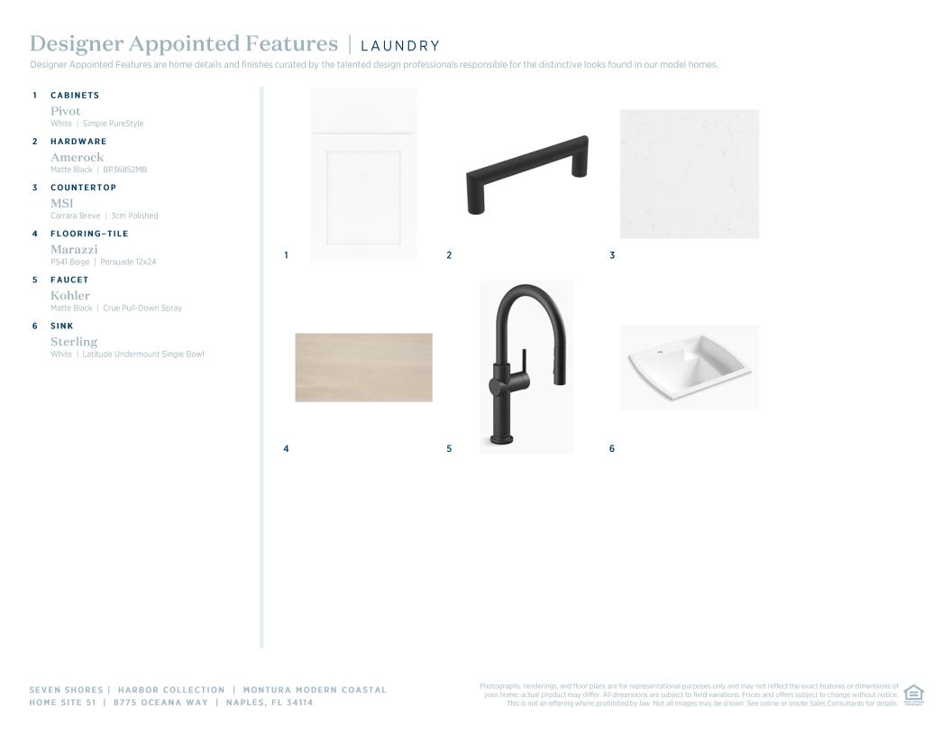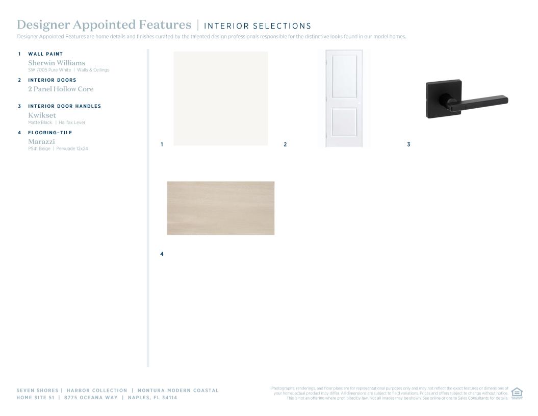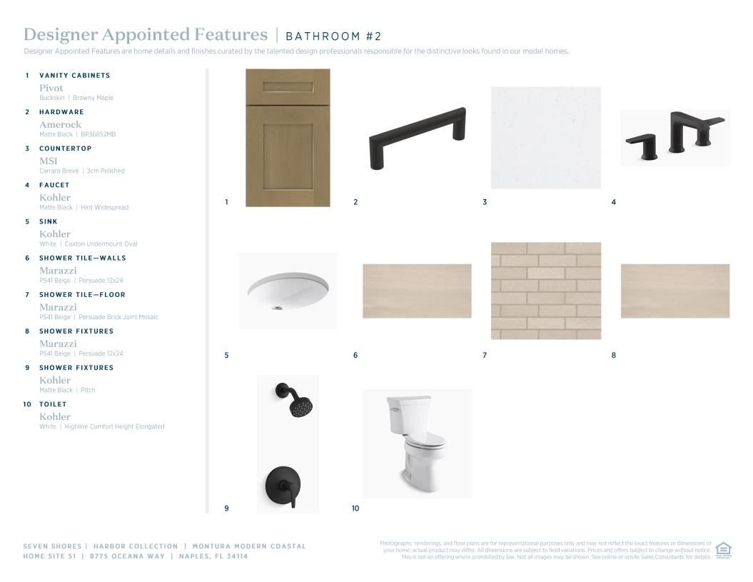 The Montura Modern Coastal blends luxury and style, featuring a spacious foyer that leads into a stunning great room with views of the large covered lanai. The open kitchen boasts ample counter space, a walk-in pantry, and a central island with a breakfast bar. The elegant primary suite offers a tray ceiling, a walk-in closet, and a spa-like bath with dual sinks, a large shower, and a private water closet. Secondary bedrooms are conveniently located off the foyer, offering ample closets and a shared hall bath. A secluded flex room is also featured in the Montura, creating a space for versatile living.