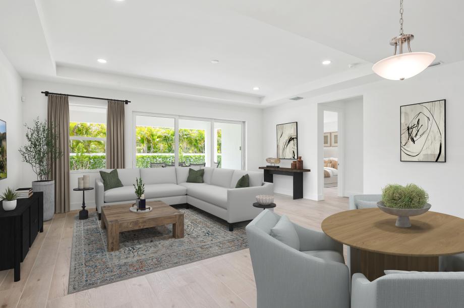 The Montura Antilles is a stunning blend of luxury and style, offering a spacious open layout perfect for modern living. The grand foyer leads to a breathtaking great room with a tray ceiling, offering views of the covered lanai. A bright, casual dining area flows into the chef-inspired kitchen, complete with a walk-in pantry, abundant cabinet and counter space, and a large central island with a breakfast bar. The luxurious primary suite features a tray ceiling, a spacious walk-in closet, and a spa-like bath with a dual-sink vanity, a large shower, linen storage, and a private water closet. Two secondary bedrooms and a shared bath are located off the foyer. A versatile flex room, convenient laundry, powder room, and everyday entry add extra functionality to the home. There’s still time to personalize your interior finishes, and the home will be ready by the end of October 2025.
