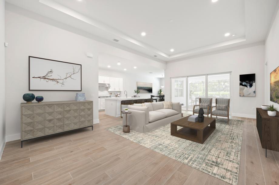 This Pinellas Modern Coastal is a stunning single-story home featuring an open-concept layout with stylish upgrades. A grand foyer leads to the spacious great room and a covered lanai perfect for outdoor relaxation. The chef-inspired kitchen boasts a large island, ample counter and cabinet space, and a walk-in pantry, seamlessly connecting to the casual dining area. The private primary suite offers dual walk-in closets and a luxurious bath with a large shower and dual-sink vanity. Two secondary bedrooms share a bath, while the home also includes a versatile flex room, a powder room, and plenty of storage.