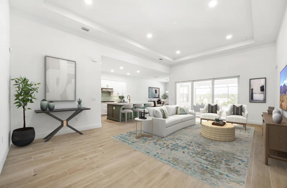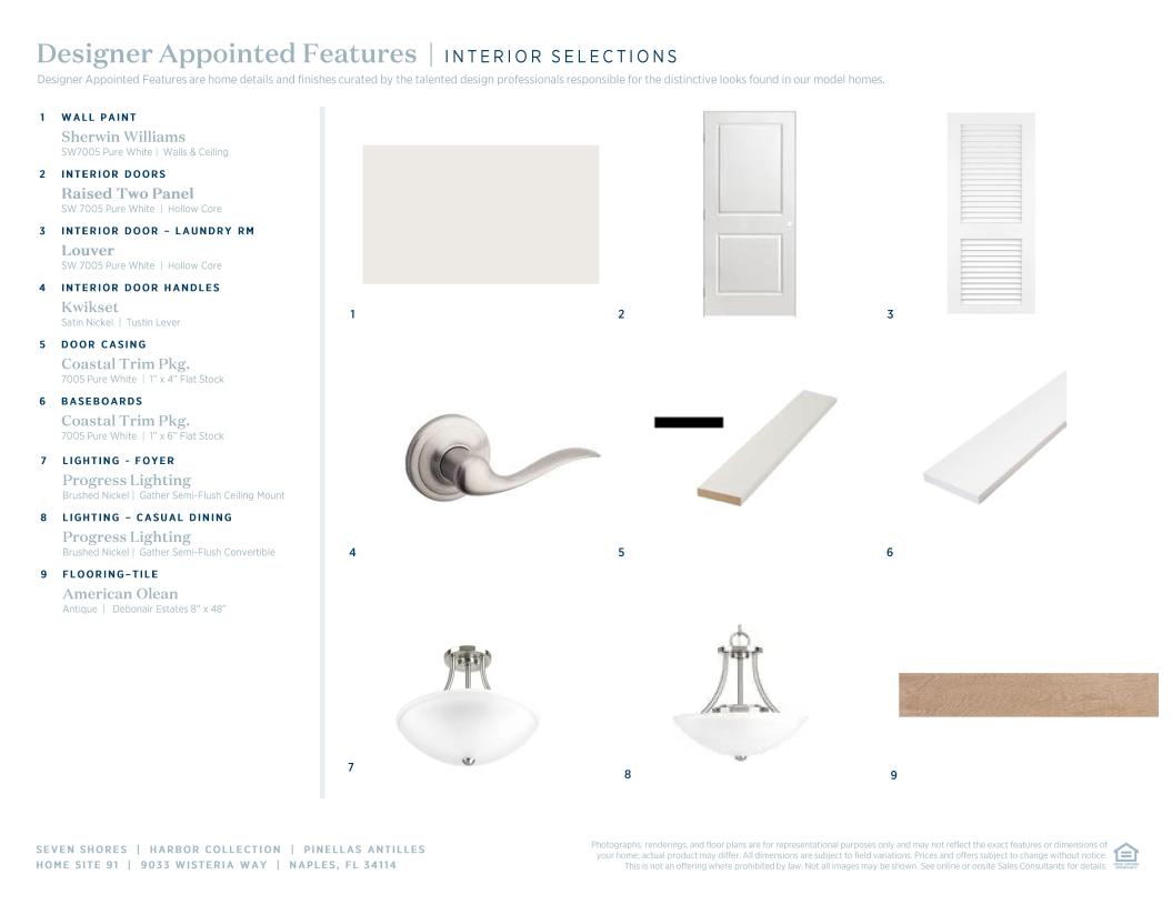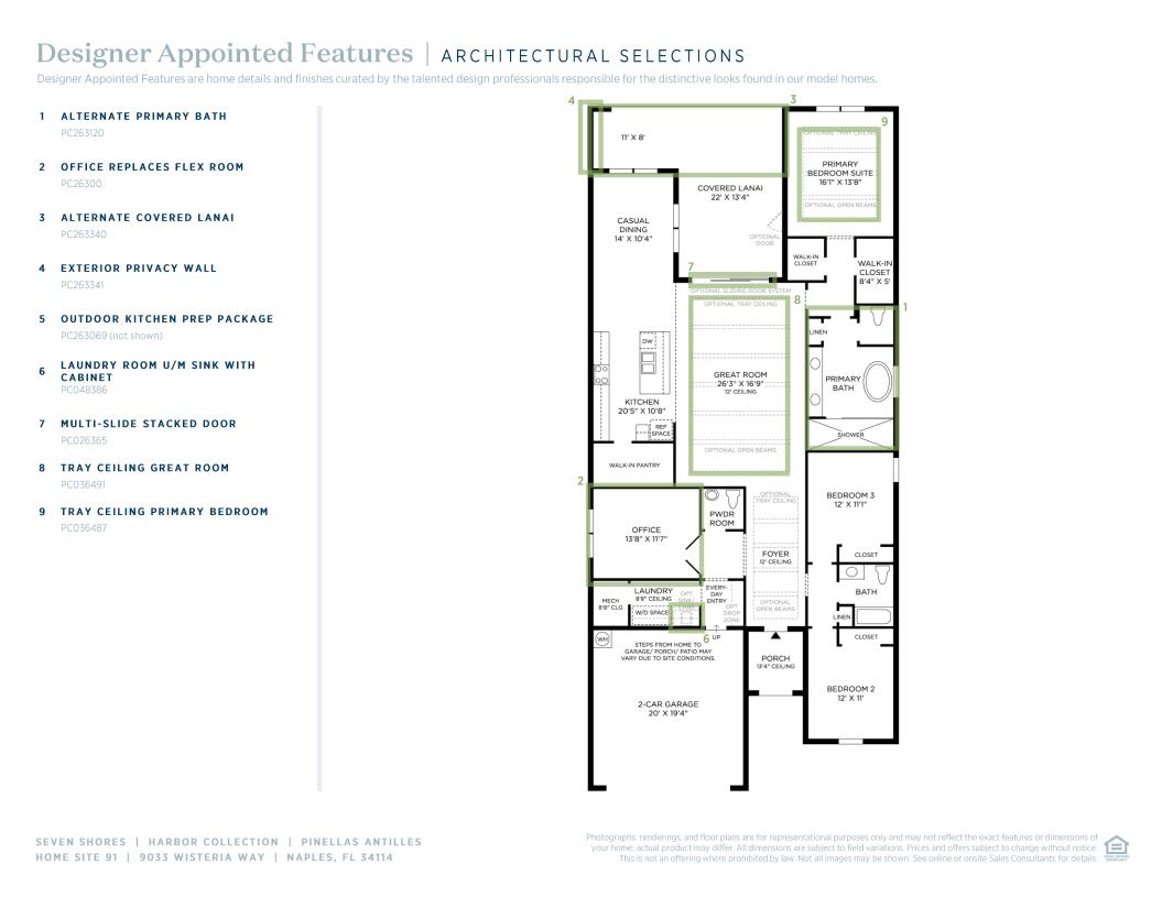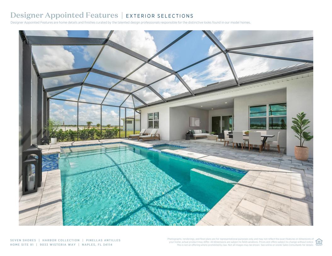 The Pinellas Antilles is an elegant single-story home with a contemporary, open design and refined details. As you enter, you're greeted by a spacious foyer that flows into a large great room and a covered lanai, ideal for relaxing outdoors. The gourmet kitchen features a generous island, plenty of cabinet space, a walk-in pantry, and seamlessly connects to the casual dining area. The private primary suite offers a peaceful escape, complete with dual walk-in closets and a luxurious bath with a large shower and dual-sink vanity. Two additional bedrooms share a full bath, while the home also includes a flexible flex room, a powder room, and ample storage throughout.