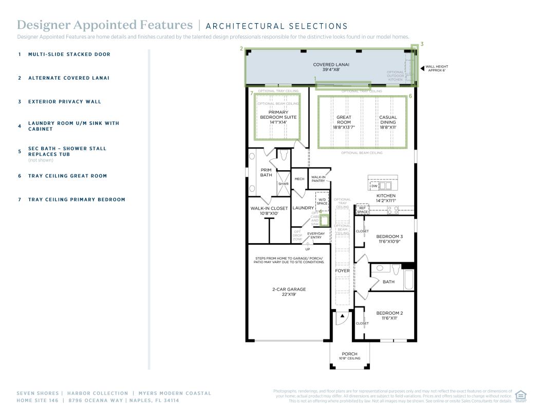 Featuring a versatile blend of indoor and outdoor living spaces, the Myers is the perfect complement to every lifestyle. An alluring foyer hallway presents views of the spacious great room and casual dining area with optional coffered ceilings and desirable access to the extensive covered lanai. A large center island with breakfast bar defines the expertly designed kitchen, featuring plenty of counter and cabinet space as well as a sizable walk-in pantry. The elegant primary bedroom suite features an expansive walk-in closet and superb primary bath featuring a dual-sink vanity, a large luxe shower, and a private water closet. Secondary bedrooms can be found off the foyer and feature roomy closets as well as a shared hall bath. The Myers also offers an easily accessible laundry, a convenient everyday entry, and plenty of additional storage.