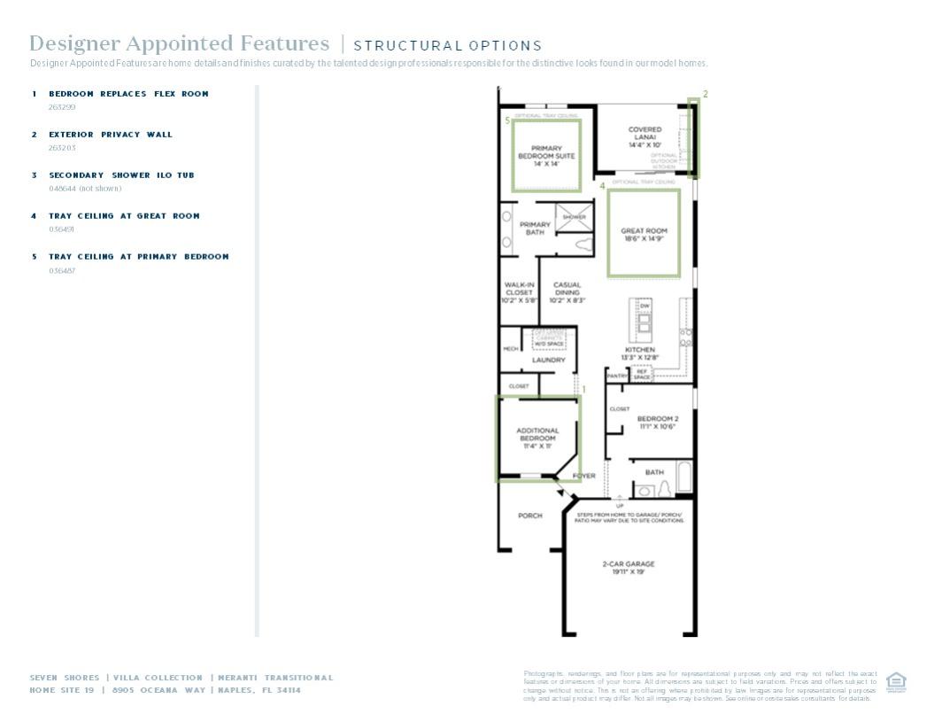 A bright foyer and flex room flow into the Meranti's airy great room with adjacent casual dining area, and views to the beautiful covered lanai. Defining the well-designed kitchen is a large center island with breakfast bar, wraparound counter and cabinet space, and a roomy pantry. The lovely primary bedroom suite is complete with a sizable walk-in closet and a spa-like primary bath with a dual-sink vanity, a large luxe shower, and a private water closet. The ample secondary bedroom features a generous closet and a shared hall bath. Additional highlights include easily accessible laundry and additional storage throughout.
