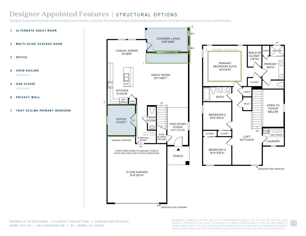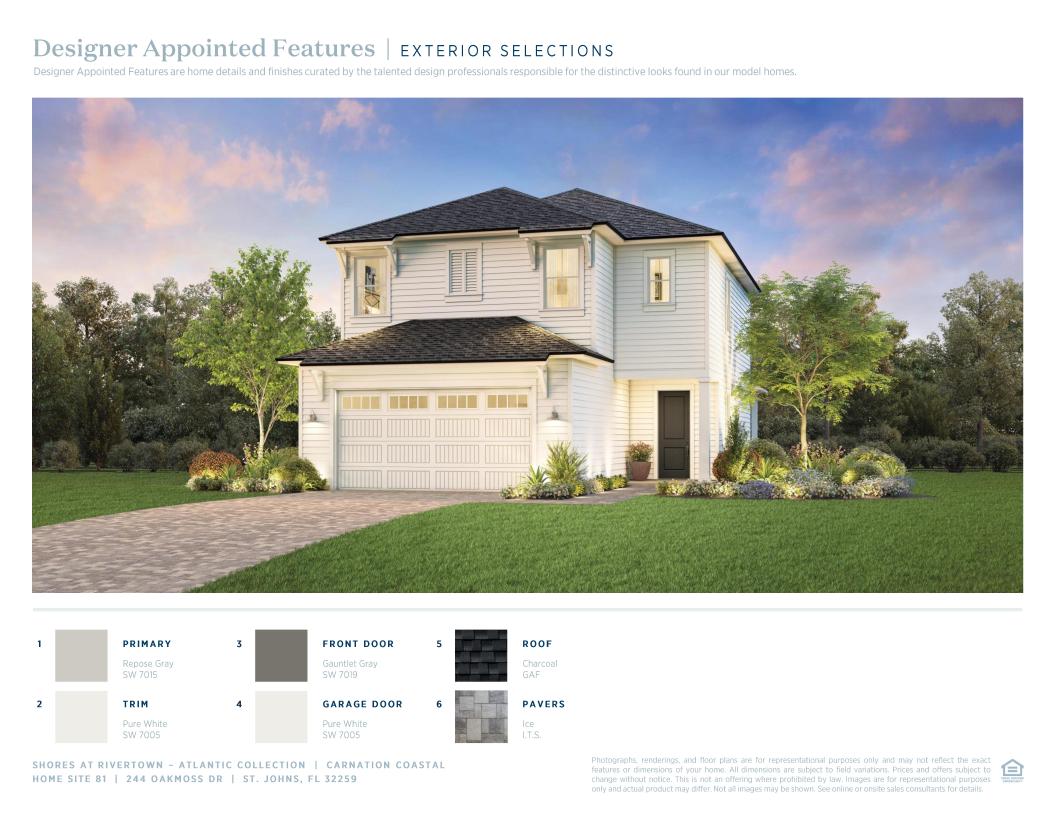 The Carnation displays an ideal blend of elegance and serenity. A charming two-story foyer seamlessly flows into the bright, open concept great room and casual dining area, complete with desirable access to the outdoor covered lanai. Enhancing the expertly crafted kitchen is plenty of counter and cabinet space as well as a large center island with breakfast bar and sizable pantry. Secluded on the second floor is the exquisite primary bedroom suite, complemented by a generous walk-in closet and spa-like primary bath featuring a large luxe shower, dual-sink vanity, linen storage, and private water closet. Adjacent to a spacious loft, secondary bedrooms offer roomy closets and a shared hall bath with dual-sink vanity. Off the great room is a versatile flex room with access to a convenient powder room and everyday entry. The Carnation also includes easily accessible bedroom-level laundry and plenty of additional storage.