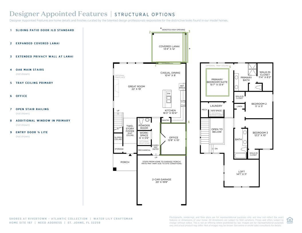 The heart of the Osprey design is an airy great room with access to a gorgeous covered lanai. The well-appointed kitchen overlooks a cozy casual dining area, and is complemented by a large center island with breakfast bar, ample counter and cabinet space, and a sizable pantry. Defining the superb primary bedroom suite is a generous walk-in closet and gorgeous primary bath with a dual-sink vanity, large luxe shower, and private water closet. Accessible to a spacious loft, secondary bedrooms feature walk-in closets and a shared hall bath with a dual-sink vanity. Additional highlights include an expansive flex room with adjacent workspace, a convenient powder room and everyday entry, easily-accessible laundry on the bedroom level, and ample additional storage.