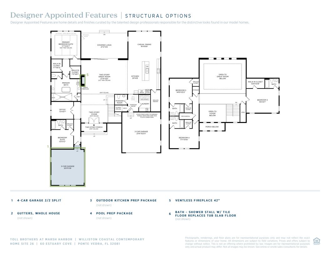 The magnificently designed Williston offers the ideal blend of luxury and function. Upon entry, a two-story foyer opens to an office and leads to the impressive two-story great room. This sprawling space features a large sliding glass door for ample natural light and direct access to the covered lanai for outdoor enjoyment. Adjacent is a casual dining area beside a well-equipped kitchen featuring a center island with breakfast bar, a walk-in pantry, and plentiful prep and cabinet space. The gorgeous primary bedroom showcases a tray ceiling, dual walk-in closets, and a sumptuous bath complete with dual vanities, a soaking tub, a spacious shower, linen storage, and a private water closet. A bedroom suite at the front of the home is ideal for guests. Upstairs offers sweeping views of the downstairs and three lovely secondary bedrooms with walk-in closets and private baths. Additional highlights include a dedicated laundry space off the everyday entry, a powder room, and extra storage throughout.