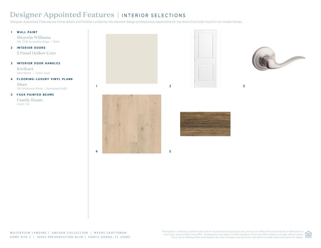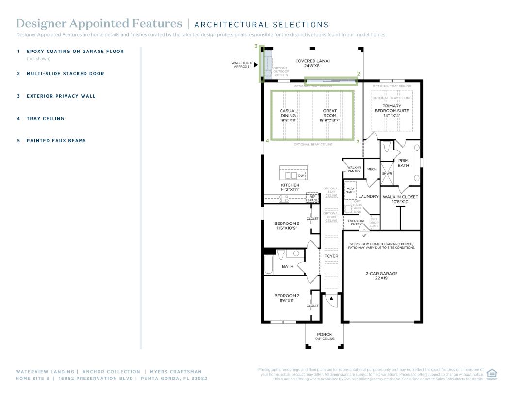 Featuring a versatile blend of indoor and outdoor living spaces, the Myers is the perfect complement to every lifestyle. An alluring foyer hallway presents views of the spacious great room and casual dining area with optional coffered ceilings and desirable access to the extensive covered lanai. A large center island with breakfast bar defines the expertly designed kitchen, featuring plenty of counter and cabinet space as well as a sizable walk-in pantry. The elegant primary bedroom suite features an expansive walk-in closet and superb primary bath featuring a dual-sink vanity, a large luxe shower, and a private water closet. Secondary bedrooms can be found off the foyer and feature roomy closets as well as a shared hall bath. The Myers also offers an easily accessible laundry, a convenient everyday entry, and plenty of additional storage.