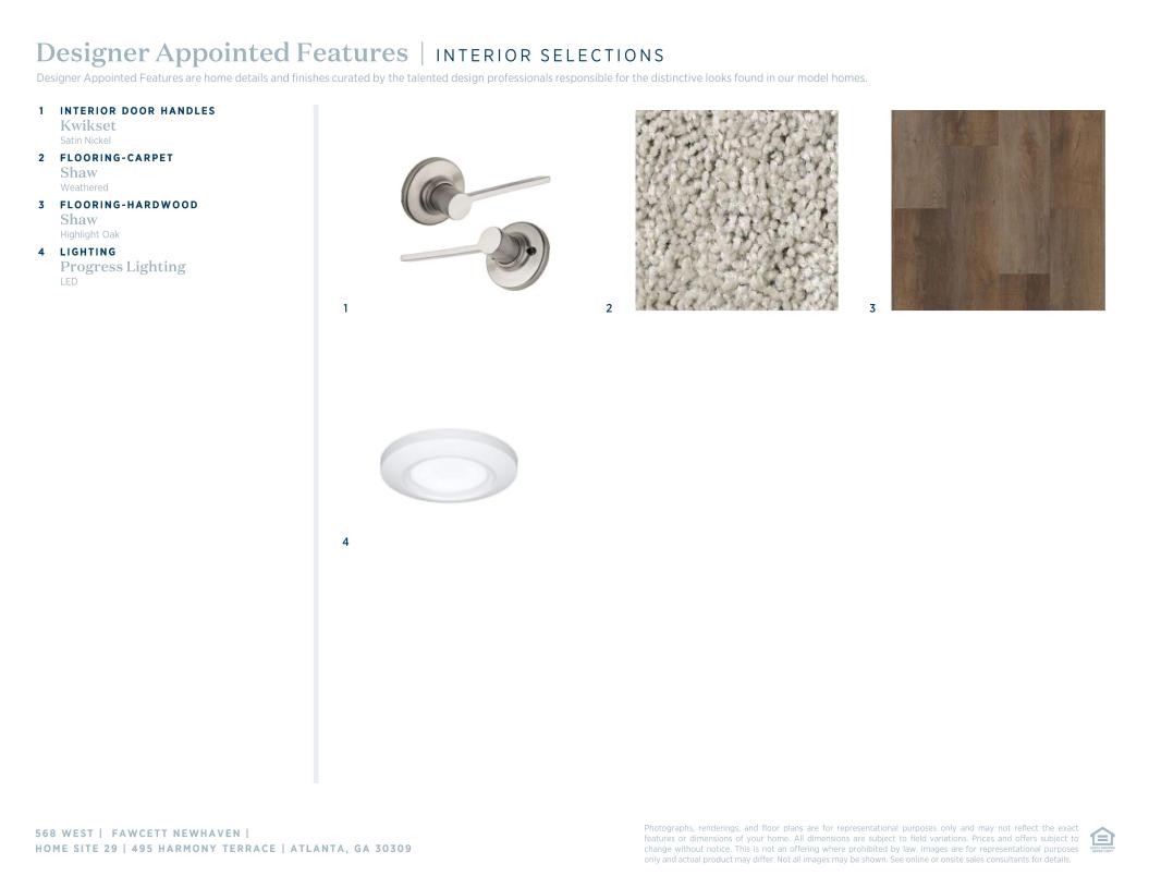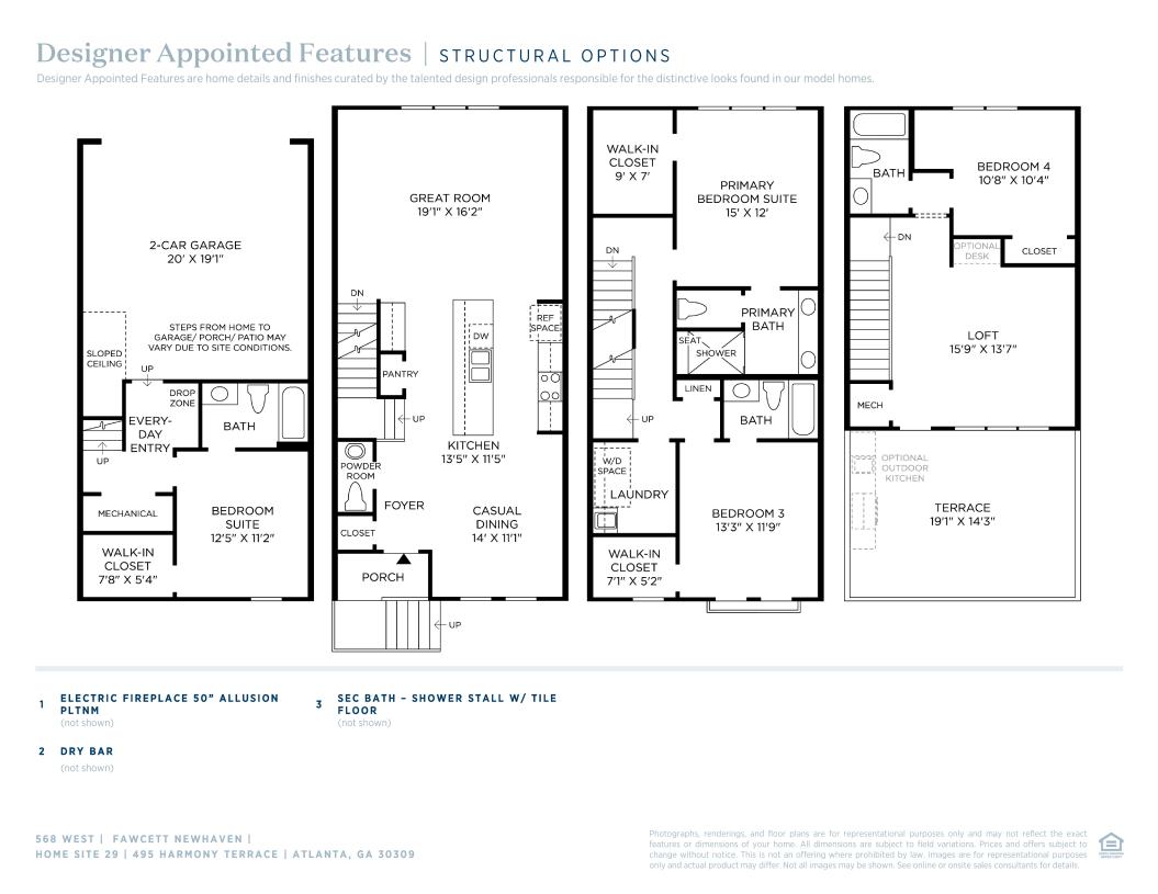 Deluxe urban family lifestyle. The Fawcett's inviting stepped covered entry and foyer flow up the welcoming stairs, revealing the spacious living room and dining room. The well-designed gourmet kitchen is highlighted by a large center island with breakfast bar, plenty of counter and cabinet space, and sizable walk-in pantry. The lovely primary bedroom suite is enhanced by a huge walk-in closet and spa-like primary bath with dual-sink vanity, large luxe shower with seat, and private water closet. The secondary bedroom features a walk-in closet and private bath. Secluded on the fourth level is a bedroom suite with walk-in closet and shared hall bath, overlooking a generous loft with rooftop terrace. Additional highlights include a first level bedroom suite with walk-in closet and private bath; convenient second level powder room and thoughtful workspace; centrally located third floor laundry; and additional storage.