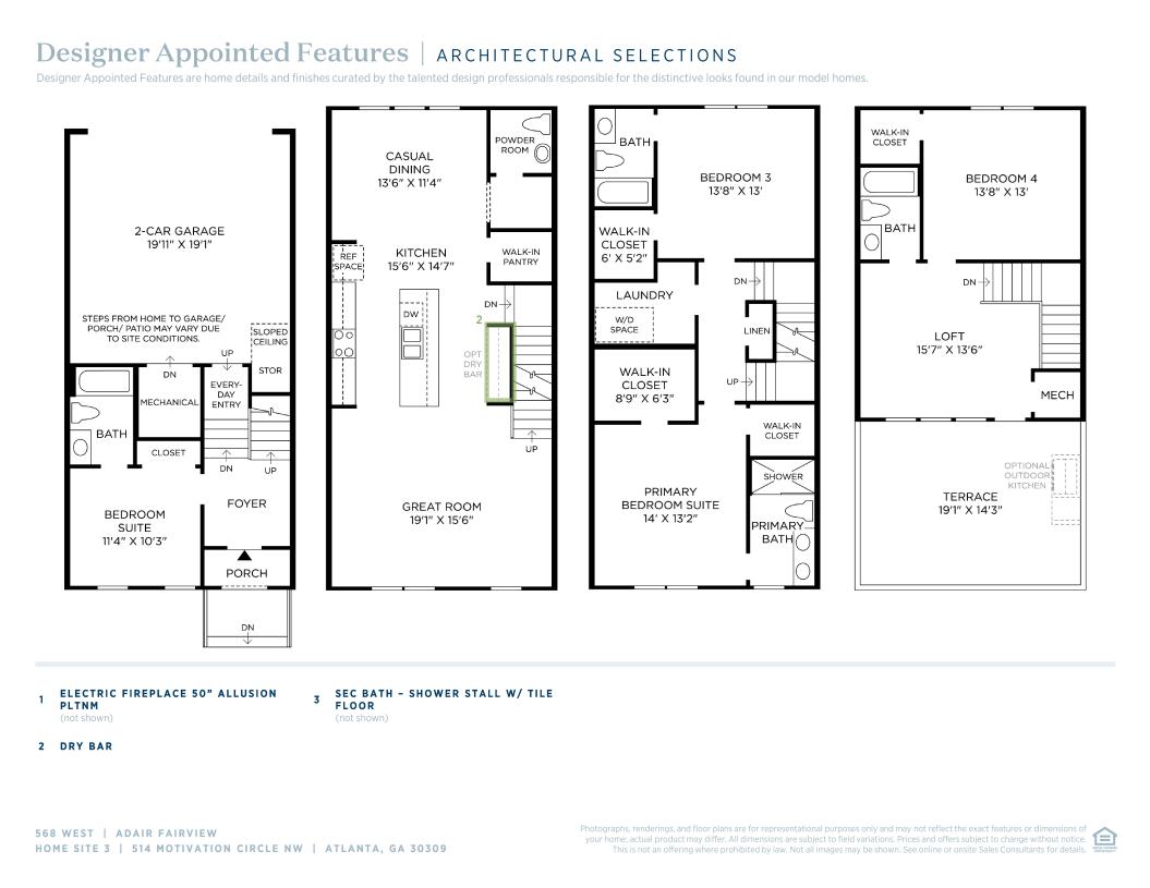 Luxe urban touches. The Adair's inviting entry and foyer reveal the welcoming stairs to the main living level, with views to the expansive living room and dining room. The well-designed gourmet kitchen is enhanced by a large center island with breakfast bar, plenty of counter and cabinet space, and sizable pantry. On the bedroom level, the stunning primary bedroom suite is complete with a gigantic walk-in closet and spa-like primary bath with dual-sink vanity, large luxe shower with seat, and private water closet. The sizable secondary bedroom features a walk-in closet and private full bath. Secluded on the rooftop level, a bedroom suite with closet and shared full hall bath overlooks a generous loft with terrace. Additional highlights include a convenient powder room on the living level, centrally located laundry on the bedroom level, and additional storage.