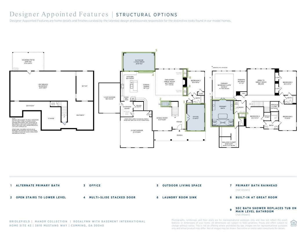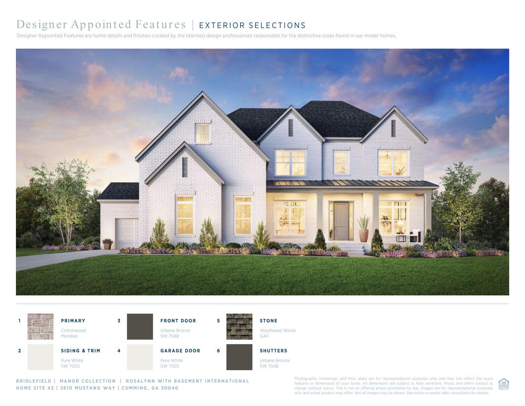 The Rosalynn with Basement home design offers a bright open floor plan with luxurious architectural elements. A welcoming foyer leads to the heart of the home, where a stunning two-story great room with a fireplace creates a dramatic focal point. Adjacent to a charming casual dining area, the gourmet kitchen features an island, wraparound counters, and a walk-in pantry. An elegant dining room provides dining space for more formal occasions. Outdoor living is enhanced by a deck, offering a perfect space for relaxation and al fresco dining. Upstairs, the gorgeous primary bedroom offers a retreat area, a tray ceiling, a spacious walk-in closet, and a luxurious bathroom with dual vanities, a soaking tub, a lavish shower, and a private water closet. Two secondary bedrooms with walk-in closets share a full bath with a separate vanity area, and one secondary bedroom with two closets has access to a full hall bath. An expansive basement provides opportunities for storage, work, and extra living space. This home also includes a versatile flex room, a first-floor secondary bedroom and full hall bath, a convenient everyday entry, and a laundry room on the bedroom level.