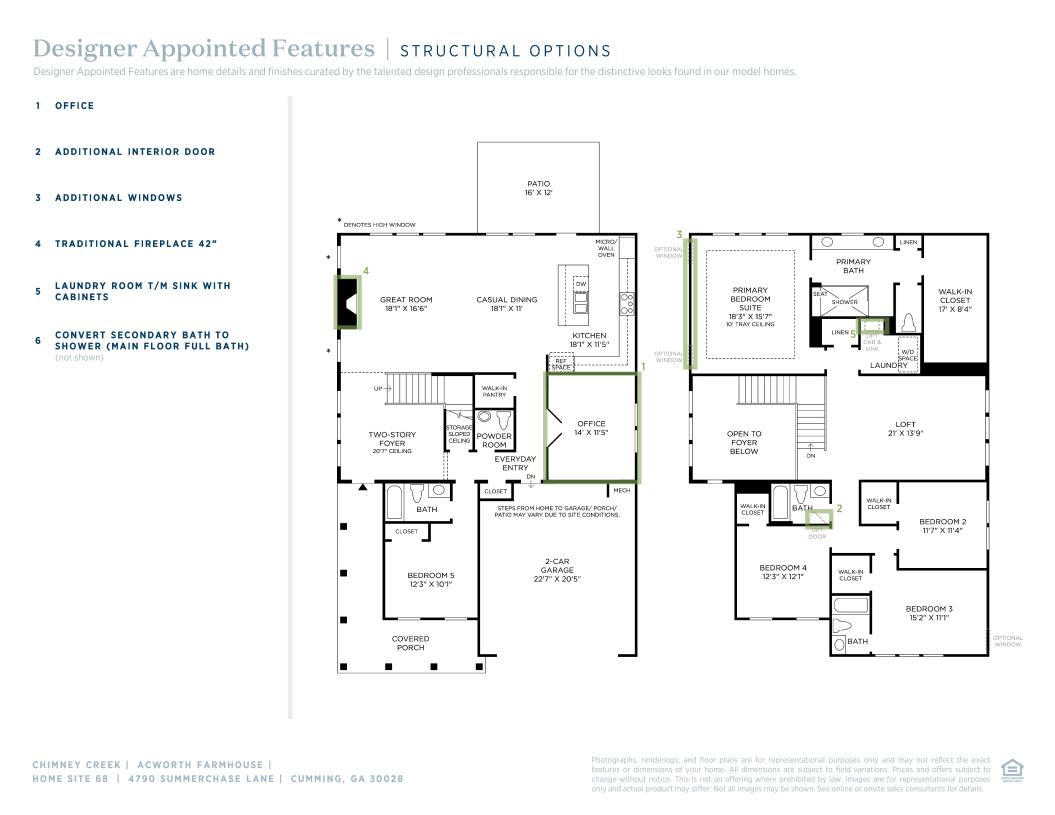 The beautifully crafted Acworth makes an instant impression with a gorgeous two-story foyer that flows into an expansive great room and casual dining area with access to the desirable rear patio. The kitchen is well-designed offering a walk-in pantry as well as wraparound counter and cabinet space surrounding a large center island with breakfast bar. The superb primary bedroom suite is complemented by a generous walk-in closet and a serene primary bath complete with dual vanities, a large shower with seat and drying area, linen storage, and a private water closet. Central to a sizable loft, secondary bedrooms feature walk-in closets and a shared hall bath with separate vanity area. A versatile first-floor bedroom with a closet and shared hall bath is also featured as well as a spacious flex room secluded off the kitchen. Additional highlights included easily accessible laundry, convenient everyday entry, and plenty of additional storage.