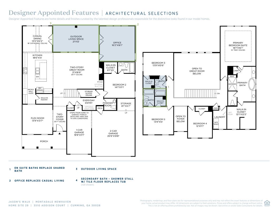 The Montadale home design offers elegance with thoughtful spaces for everyday living. From the moment you step into the dramatic two-story foyer, you’re drawn into the heart of the home, where a two-story great room with a cozy fireplace creates a warm and inviting centerpiece. The open-concept layout seamlessly connects the gourmet kitchen to a casual living space and a casual dining area with a cathedral ceiling that’s perfect for hosting family and friends. The kitchen is expertly crafted with an oversized center island and a walk-in pantry. Upstairs, the luxurious primary suite is a peaceful retreat, equipped with a tray ceiling, a spacious walk-in closet, and a lush private bath with dual vanities, a soaking tub, a large shower with seat, and a private water closet. Secondary bedrooms share a full hall bath and are central to a conveniently located laundry room. An additional secondary bedroom is secluded on the first floor, enhanced with a private bath and a walk-in closet. Additional features of the home include a rear patio, a versatile flex room, an everyday entry, and plenty of storage.
