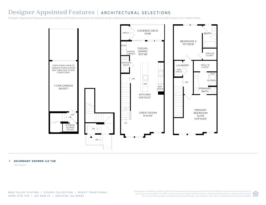 The McKoy's welcoming staired entryway and inviting stairs to the living level reveal the spacious living room, lovely dining room, and desirable covered balcony. The well-designed kitchen is highlighted by a large center island with breakfast bar, and plenty of counter and cabinet space. The charming primary bedroom suite is complete with an ample walk-in closet and spa-like primary bath with dual-sink vanity and luxe shower with seat. The sizable secondary bedroom features a walk-in closet and private bath. Additional highlights include a convenient powder room and thoughtful workspace on the living level, centrally located laundry on the bedroom level, and additional storage on the garage level.