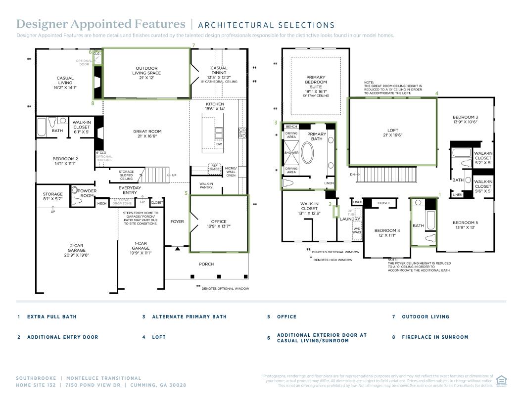 Enhanced by luxury appointments and elegant architecture, the Monteluce offers inviting living spaces inside and out. The soaring two-story foyer opens onto a large flex room and an airy two-story great room, overlooking the spacious rear patio beyond. Adjacent to a casual dining area with a cathedral ceiling, the kitchen is expertly crafted with an oversized center island with breakfast bar, plenty of counter and cabinet space, a sizable walk-in pantry, and passthrough to the front flex room. The elegant primary bedroom suite is highlighted by an alluring tray ceiling, a palatial walk-in closet, and a spa-like primary bath with dual vanities, a large soaking tub, luxe shower with seat, linen storage, and a private water closet. The secondary bedrooms, two with walk-in closets, share a hall bath with separate vanity area. A versatile first-floor bedroom with a walk-in closet and a private bath can be found off the foyer with an additional casual living area located off the great room. Also offered in the Monteluce is easily accessible second-floor laundry, a powder room off the everyday entry, and additional storage throughout.