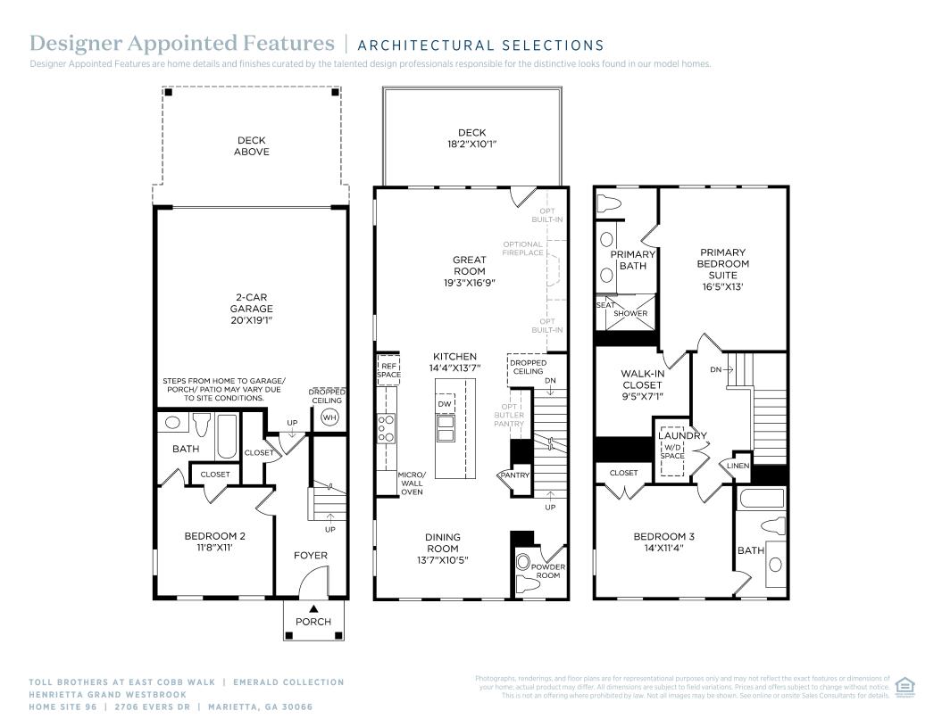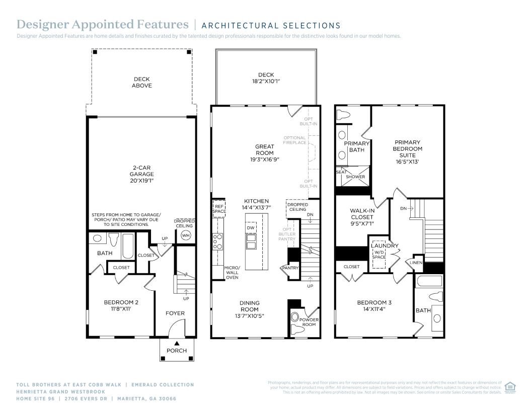The Henrietta Grand features an open floor plan that blends luxury with style. Step inside the cozy foyer with stairs that lead up to the main living level. A beautiful great room seamlessly connects to the kitchen and a covered deck, creating an ideal environment for relaxing and entertaining. The kitchen is well-appointed, overlooking a cozy dining room and enhanced by a spacious center island that provides additional prep space and casual seating. The primary suite is tucked away on the third level, complete with an expansive walk-in closet and a luxurious private bath featuring dual sinks and a large shower with seat. Two secondary bedrooms, one on the third floor and one on the first floor, offer private baths and enhanced comfort for family or guests. Additional highlights include bedroom-level laundry, a convenient powder room on the main living level, and plenty of storage throughout.