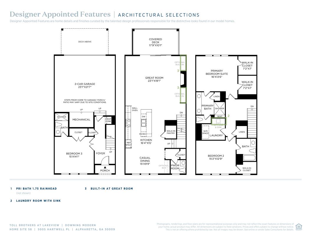 The Downing offers a thoughtful layout across three levels with a welcoming foyer that seamlessly flows up to the second level. An open-concept living area is highlighted by a spacious great room that features direct access to an outdoor covered deck. A cozy casual dining area overlooks the well-appointed kitchen, complete with a large island and walk-in pantry. The luxurious primary suite is secluded on the third floor, enhanced by dual walk-in closets and a lush private bath with dual sinks, a luxe shower with seat, and a private water closet. Adjacent, a secondary bedroom features a walk-in closet and a private bath as well. Another secondary bedroom is conveniently located on the first floor off the foyer, complete with a private bath. Also offered in the home is third-level laundry, a convenient drop zone on the first floor, a powder room on the main living level, and plenty of storage.