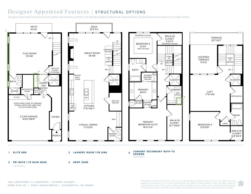 Step into luxury living with The Vickery. The inviting covered entry sets the tone for warmth and comfort as you enter. Designed for seamless living, the flow from the spacious flex room to the second-floor main living area offers an expansive great room, casual dining space, and a covered large deck with multi-slide stacked doors—perfect for everyday living and entertaining. The centerpiece of this home is the well-appointed kitchen, featuring a large center island with a breakfast bar for effortless meal preparation. Retreat to the luxurious primary bedroom suite on the third floor, complete with dual walk-in closets and a spa-like primary bath with dual vanities, a spacious luxe shower with a seat, freestanding tub, and linen storage—all tailored for your ultimate comfort. Find serenity on the fourth floor in your own private sanctuary, featuring an additional bedroom, shared hall bath, and a generous loft overlooking the partially covered rooftop terrace—offering a cozy and secluded space to unwind and relax.