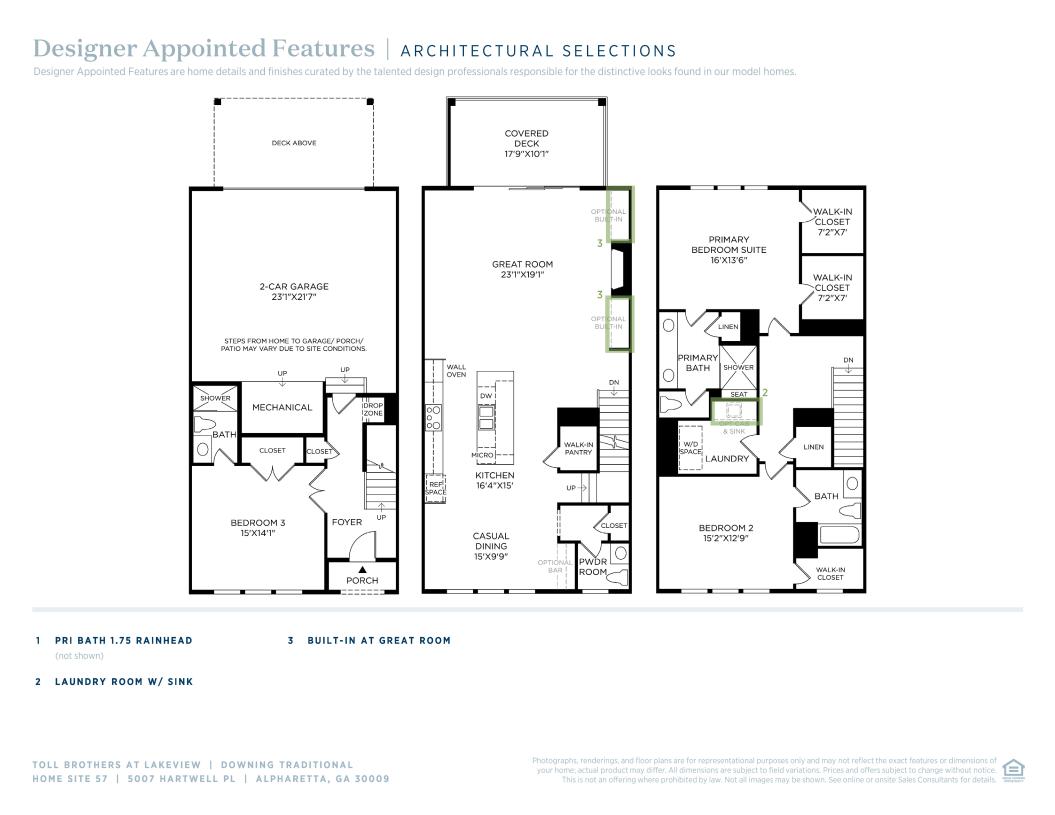 The Downing offers a thoughtful layout across three levels with a welcoming foyer that seamlessly flows up to the second level. An open-concept living area is highlighted by a spacious great room that features direct access to an outdoor covered deck. A cozy casual dining area overlooks the well-appointed kitchen, complete with a large island and walk-in pantry. The luxurious primary suite is secluded on the third floor, enhanced by dual walk-in closets and a lush private bath with dual sinks, a luxe shower with seat, and a private water closet. Adjacent, a secondary bedroom features a walk-in closet and a private bath as well. Another secondary bedroom is conveniently located on the first floor off the foyer, complete with a private bath. Also offered in the home is third-level laundry, a convenient drop zone on the first floor, a powder room on the main living level, and plenty of storage.