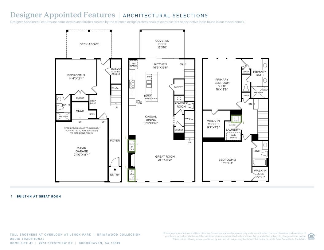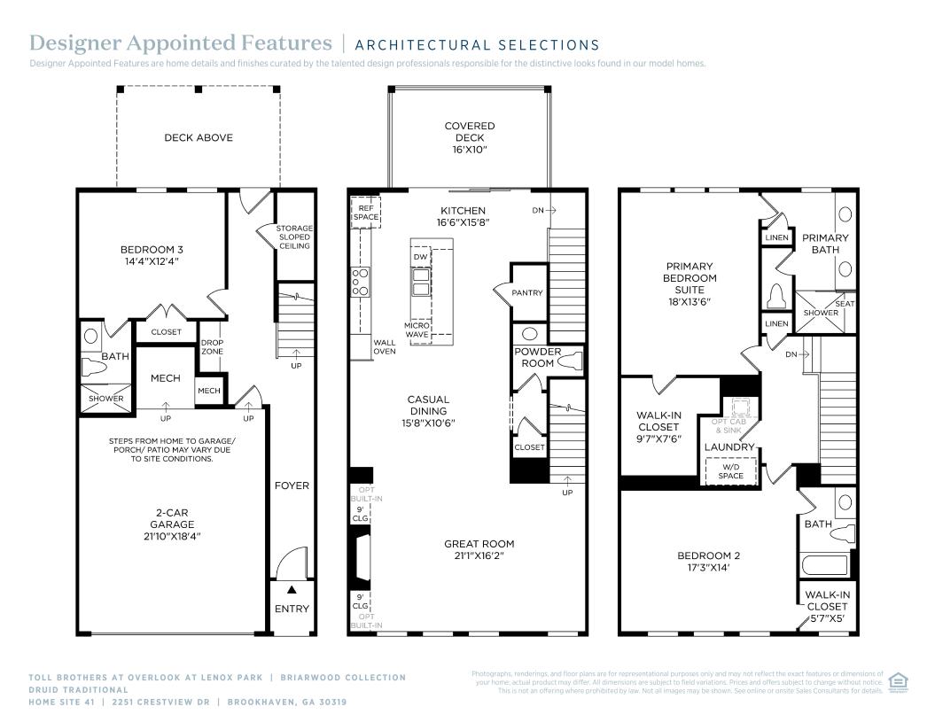The Druid offers elevated living across three thoughtfully designed levels. A welcoming foyer opens to a secondary bedroom with a private bath—ideal for guests or extended stays. On the second floor, the open-concept main living area connects a spacious great room, casual dining space, and kitchen with a large center island and pantry. Just off the dining area, a covered deck offers outdoor living on both the second and first levels. Upstairs, the private primary suite features a generous walk-in closet and a spa-inspired bath with a dual-sink vanity, a shower with seat, and a private water closet. A secondary bedroom with a private bath and walk-in closet adds comfort and privacy. Additional highlights include a third-floor laundry, a second-floor powder room, and abundant storage throughout.