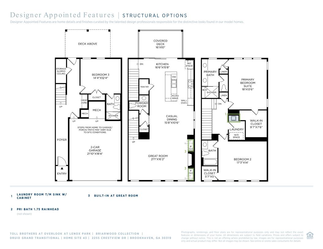 The Druid Grand delivers elevated comfort and versatility across three stylish levels. Upon entering the welcoming foyer, a private secondary bedroom with full bath provides a quiet escape for guests or extended stays. The second floor opens to a spacious great room, flowing into a casual dining area and a thoughtfully designed kitchen with a large center island and walk-in pantry. A covered deck just off the dining space enhances the home’s indoor-outdoor living. Upstairs, the primary suite serves as a refined escape, offering a walk-in closet and a spa-inspired bath with dual vanities, a shower with seat, and a private water closet. A secondary bedroom with a private bath and walk-in closet adds flexibility, while a centrally located laundry and generous storage support daily routines.