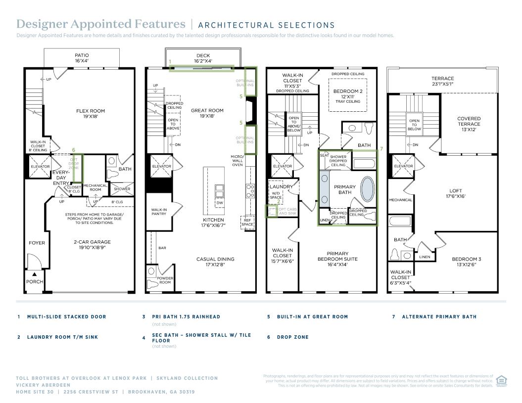 Step into luxury living with The Vickery. The inviting covered entry sets the tone for warmth and comfort as you enter. Designed for seamless living, the flow from the spacious flex room to the second-floor main living area offers an expansive great room, casual dining space, and a covered large deck with multi-slide stacked doors—perfect for everyday living and entertaining. The centerpiece of this home is the well-appointed kitchen, featuring a large center island with a breakfast bar for effortless meal preparation. Retreat to the luxurious primary bedroom suite on the third floor, complete with dual walk-in closets and a spa-like primary bath with dual vanities, a spacious luxe shower with a seat, freestanding tub, and linen storage—all tailored for your ultimate comfort. Find serenity on the fourth floor in your own private sanctuary, featuring an additional bedroom, shared hall bath, and a generous loft overlooking the partially covered rooftop terrace—offering a cozy and secluded space to unwind and relax.