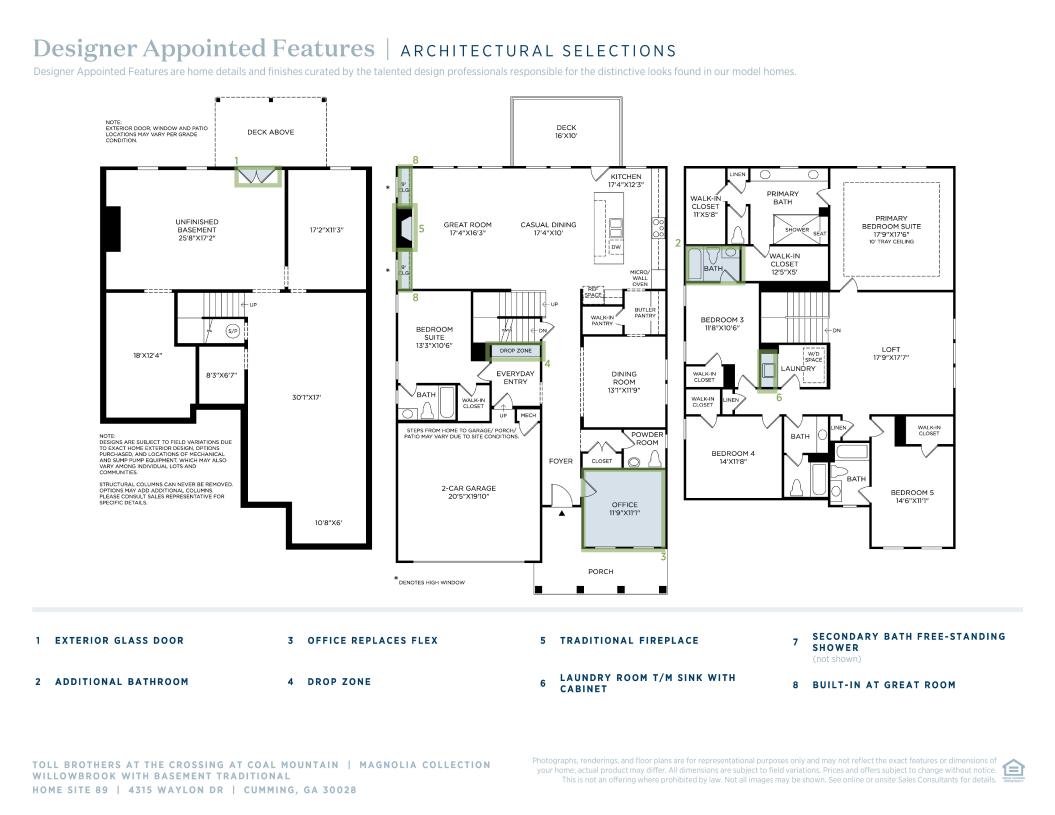 The Willowbrook with Basement home design offers a thoughtful blend of elegance and functionality. The foyer opens to a versatile flex room and an elegant formal dining room. The heart of the home features an open-concept layout with a spacious great room flowing seamlessly into the casual dining area and gourmet kitchen. The kitchen boasts a large center island, walk-in pantry, and butler's pantry, perfect for entertaining. A gorgeous deck extends the main living space for fresh-air living. A secondary bedroom suite off the everyday entry includes a private bath and walk-in closet offers comfort and privacy for family or guests. Upstairs, the primary suite features a tray ceiling, dual walk-in closets, and a luxurious bathroom featuring a dual-sink vanity, a shower with seat, and a private water closet. Three additional secondary bedrooms, one with a private bath and two sharing a hall bath, a convenient second-level laundry room, and a versatile loft space complete the upper floor.