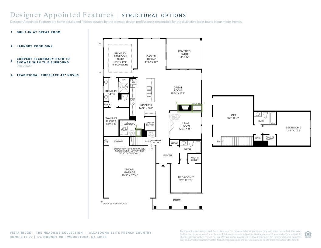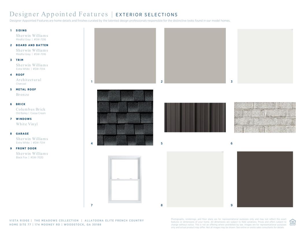 The Allatoona Elite’s smart design offer elegant spaces for a modern lifestyle. A bright foyer reveals a sizable flex room and the spacious great room, offering views to the lovely covered patio. Defining the well-designed kitchen is an airy casual dining area, a large center island with breakfast bar, plenty of counter and cabinet space, and a roomy walk-in pantry. The charming primary bedroom suite is highlighted by a beautiful tray ceiling, an ample walk-in closet, and a serene primary bath with a dual-sink vanity, a large luxe shower with seat, linen storage, and a private water closet. A large secondary bedroom features a walk-in closet and a shared hall bath. Secluded on the second floor and adjacent to a generous loft and a full hall bath is an additional bedroom with a walk-in closet. Additional highlights include conveniently located laundry and plenty of additional storage.