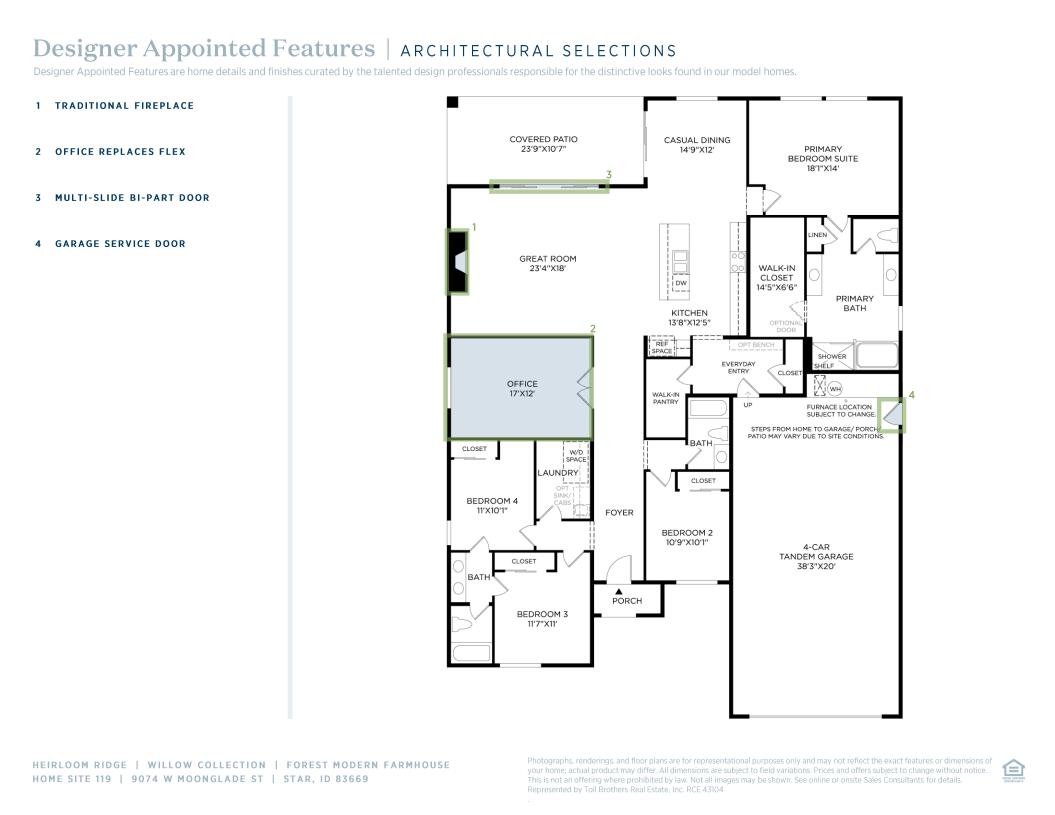 Stunning one-story home presents a charming front porch. Inside the foyer, an impressive great room warmly welcomes guests and offers easy access to the casual dining area and kitchen with a center island - perfect for entertaining. Additionally, the home features a flex room adjacent to the main living spaces, ideal for versatile use as an office or intimate formal dining space. Highlighting community spaces of the home is a covered patio accessed from the casual dining via beautiful sliding glass doors that provide plenty of natural light. Primary bedroom suite includes a luxurious en-suite bath featuring private water closet, separate soaking tub, dual vanities, and a tile surround shower with semi-frameless enclosure.
