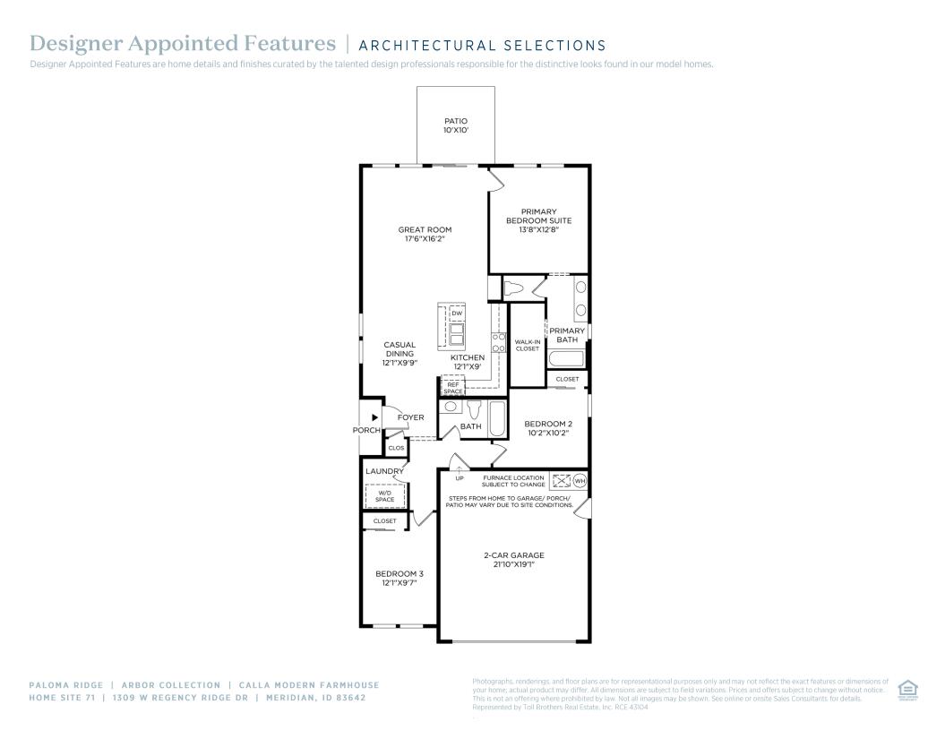 Featuring an alluring open-concept floor plan, the wonderfully crafted Calla is the perfect complement to every lifestyle. A beautiful great room and casual dining area overlook the desirable rear patio as well as the well-appointed kitchen, offering a roomy pantry and wraparound counter and cabinet space that surrounds a large center island with breakfast bar. Highlighting the charming primary bedroom suite is a generous walk-in closet and a spa-like primary bath with dual-sink vanity, a large luxe shower, and a private water closet. Found off the foyer, secondary bedrooms feature sizable closets and share a hall bath. Additional highlights include conveniently located laundry, an everyday entry, and ample additional storage.